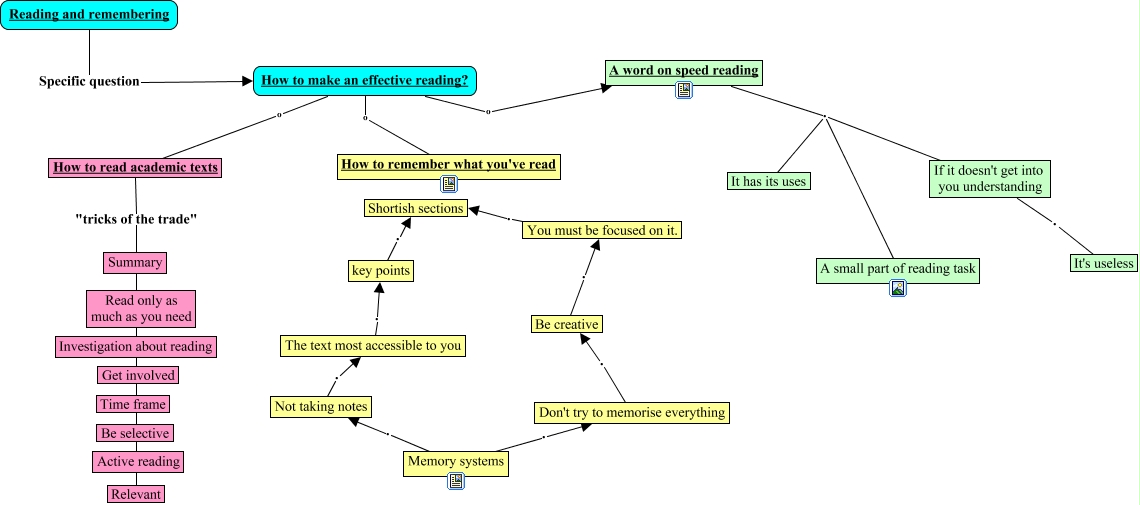Este Cmap, tiene información relacionada con: Mi Cmap, The text most accessible to you . key points, Not taking notes . The text most accessible to you, Don't try to memorise everything . Be creative, A word on speed reading . If it doesn't get into you understanding, Memory systems . Not taking notes, How to make an effective reading? º How to remember what you've read, key points . Shortish sections, Reading and remembering Specific question How to make an effective reading?, How to make an effective reading? º A word on speed reading, You must be focused on it. . Shortish sections, A word on speed reading . It has its uses, Memory systems . Don't try to memorise everything, If it doesn't get into you understanding . It's useless, Be creative . You must be focused on it., A word on speed reading . A small part of reading task, How to make an effective reading? º How to read academic texts, How to read academic texts "tricks of the trade" Relevant