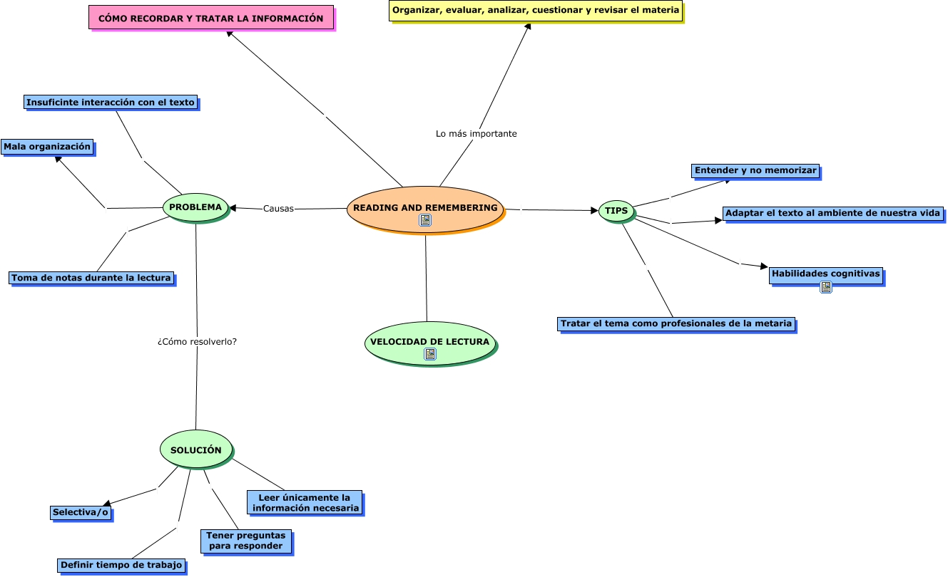 Este Cmap, tiene información relacionada con: RECORDAR Y SABER TRATAR LA INFORMACIÓN, READING AND REMEMBERING ???? VELOCIDAD DE LECTURA, TIPS Entender y no memorizar, SOLUCIÓN Tener preguntas para responder, TIPS Tratar el tema como profesionales de la metaria, TIPS Adaptar el texto al ambiente de nuestra vida, SOLUCIÓN ???? Leer únicamente la información necesaria, READING AND REMEMBERING TIPS, PROBLEMA ¿Cómo resolverlo? SOLUCIÓN, TIPS Habilidades cognitivas, READING AND REMEMBERING CÓMO RECORDAR Y TRATAR LA INFORMACIÓN, READING AND REMEMBERING Causas PROBLEMA, PROBLEMA Mala organización, PROBLEMA Toma de notas durante la lectura, SOLUCIÓN Selectiva/o, READING AND REMEMBERING Lo más importante Organizar, evaluar, analizar, cuestionar y revisar el materia, SOLUCIÓN Definir tiempo de trabajo, Insuficinte interacción con el texto PROBLEMA