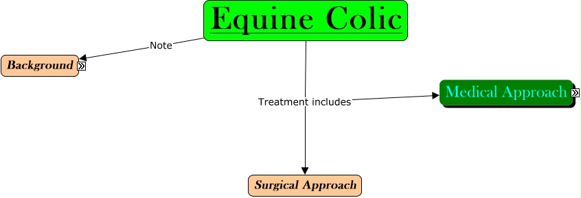 This Concept Map, created with IHMC CmapTools, has information related to: Equine colic, Medical Approach LAXATIVES, Medical Approach PAIN MANAGEMENT, Medical Approach ANTISPASMOLYTIC DRUGS, Medical Approach FLUID THERAPY, Equine Colic Treatment includes Surgical Approach, Equine Colic Note Background, Equine Colic Treatment includes Medical Approach