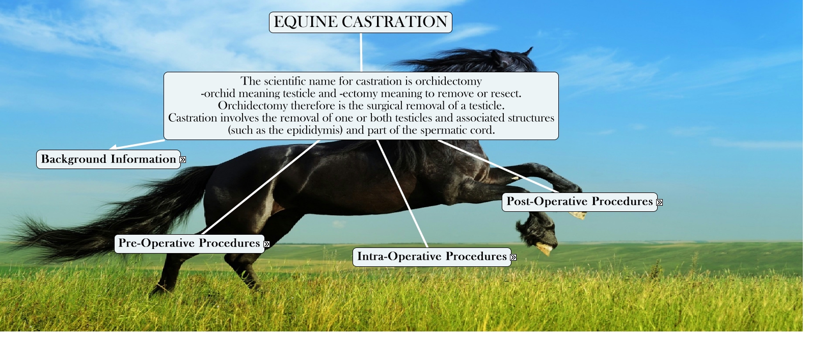 This Concept Map, created with IHMC CmapTools, has information related to: Equine Castration, The scientific name for castration is orchidectomy -orchid meaning testicle and -ectomy meaning to remove or resect. Orchidectomy therefore is the surgical removal of a testicle. Castration involves the removal of one or both testicles and associated structures (such as the epididymis) and part of the spermatic cord. Intra-Operative Procedures, The scientific name for castration is orchidectomy -orchid meaning testicle and -ectomy meaning to remove or resect. Orchidectomy therefore is the surgical removal of a testicle. Castration involves the removal of one or both testicles and associated structures (such as the epididymis) and part of the spermatic cord. Post-Operative Procedures, The scientific name for castration is orchidectomy -orchid meaning testicle and -ectomy meaning to remove or resect. Orchidectomy therefore is the surgical removal of a testicle. Castration involves the removal of one or both testicles and associated structures (such as the epididymis) and part of the spermatic cord. Pre-Operative Procedures, EQUINE CASTRATION The scientific name for castration is orchidectomy -orchid meaning testicle and -ectomy meaning to remove or resect. Orchidectomy therefore is the surgical removal of a testicle. Castration involves the removal of one or both testicles and associated structures (such as the epididymis) and part of the spermatic cord., The scientific name for castration is orchidectomy -orchid meaning testicle and -ectomy meaning to remove or resect. Orchidectomy therefore is the surgical removal of a testicle. Castration involves the removal of one or both testicles and associated structures (such as the epididymis) and part of the spermatic cord. Background Information