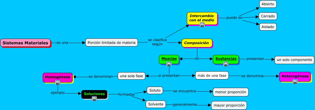 Este Cmap, tiene información relacionada con: Sistemas Materiales, Homogéneas ejemplo Soluciones, Sistemas Materiales es una Porción limitada de materia, Soluto se encuentra menor proporción, Soluciones formadas Soluto, Intercambio con el medio puede se Cerrado, Mezclas si presentan más de una fase, Porción limitada de materia se clasifica según Intercambio con el medio, Composición en Sustancias, Solvente generalmente mayor proporción, más de una fase se denomina Heterogéneas, Intercambio con el medio puede se Aislado, Porción limitada de materia se clasifica según Composición, Soluciones formadas Solvente, Composición en Mezclas, Mezclas si presentan una sola fase, Intercambio con el medio puede se Abierto, Sustancias presentan un solo componente, una sola fase se denominan Homogéneas