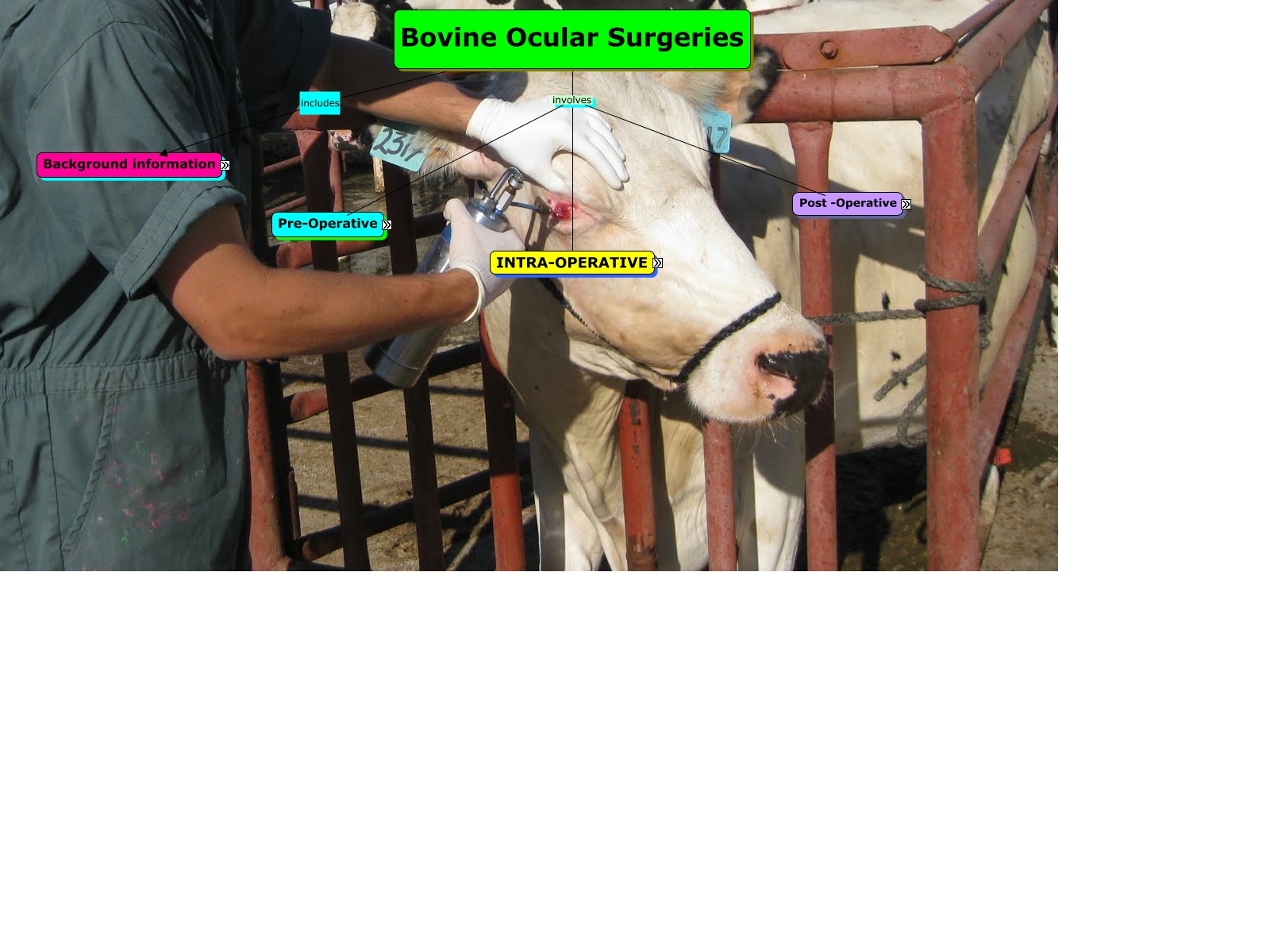 This Concept Map, created with IHMC CmapTools, has information related to: cmap, Pre Operative includes Signalment, Post Operative which includes Complications (mouse over), Bovine Ocular Surgeries involves Pre Operative, Post Operative which includes Post- Op care (mouse over), Background information includes complications (scroll over), Post Operative which includes Client Information (mouse over), Background information includes Exenteration (scroll over), Ocular surgeries require Nerve blocks, Pre Operative includes History, Nerve blocks for Third-eyelid Romval, Pre Operative includes Physical Examination (mouse over), Nerve blocks for Enucleation, Pre Operative includes Restraint (mouse over), Post Operative which includes Drugs (mouse over), Background information includes Anatomy of Eye, Bovine Ocular Surgeries involves Post Operative, Ocular surgeries others (not done in lab) Eviseration, Background information includes third eyelid removal (scroll over), Ocular surgeries others (not done in lab) Extenseration, Bovine Ocular Surgeries involves INTRA-OPERATIVE