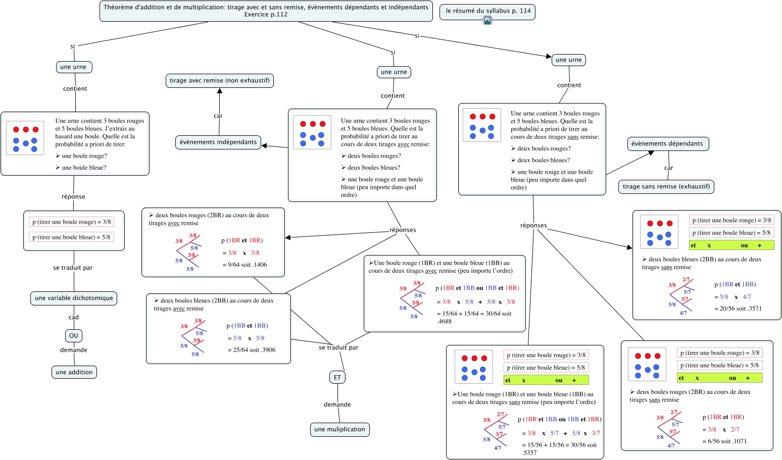 Cette carte de concepts créée avec IHMC CmapTools traite de: 1.51 et 2 Théorème d'additions et de multiplication, se traduit par ET, Théorème d'addition et de multiplication: tirage avec et sans remise, évènements dépendants et indépendants Exercice p.112 si une urne, réponses, évènements indépendants car tirage avec remise (non exhaustif), ???? évènements indépendants, Théorème d'addition et de multiplication: tirage avec et sans remise, évènements dépendants et indépendants Exercice p.112 si une urne, réponses, se traduit par ET, ET demande une muliplication, une variable dichotomique càd OU, ???? évènements dépendants, réponses, réponses, évènements dépendants car tirage sans remise (exhaustif), réponse, une urne contient, OU demande une addition, réponses, réponses, se traduit par une variable dichotomique
