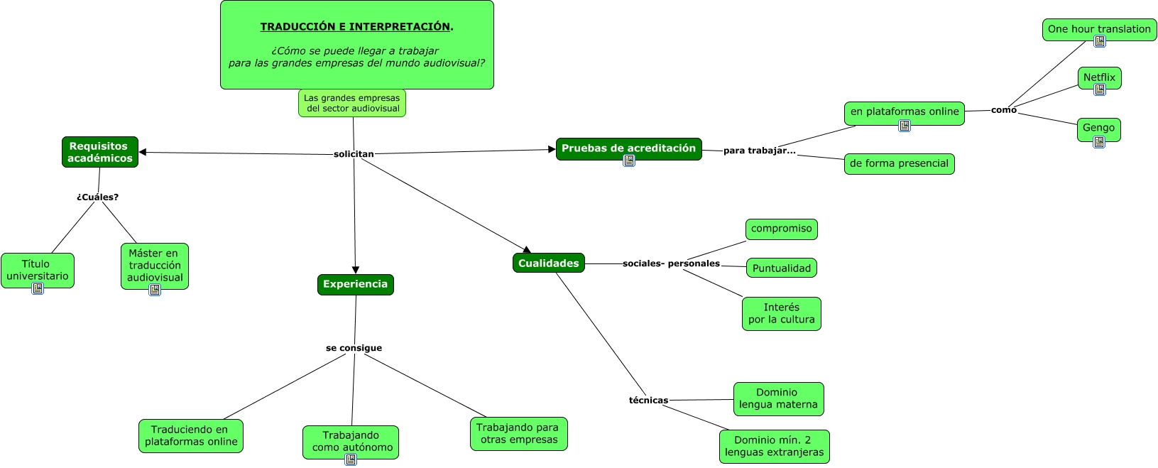 Este Cmap, tiene información relacionada con: FOCUS QUESTION, Cualidades técnicas Dominio mín. 2 lenguas extranjeras, Cualidades técnicas Dominio lengua materna, Las grandes empresas del sector audiovisual solicitan Cualidades, Cualidades sociales- personales compromiso, Pruebas de acreditación para trabajar... en plataformas online, Experiencia se consigue Trabajando como autónomo, Pruebas de acreditación para trabajar... de forma presencial, Requisitos académicos ¿Cuáles? Título universitario, Las grandes empresas del sector audiovisual solicitan Experiencia, Las grandes empresas del sector audiovisual solicitan Requisitos académicos, en plataformas online como One hour translation, en plataformas online como Netflix, Experiencia se consigue Trabajando para otras empresas, en plataformas online como Gengo, Cualidades sociales- personales Puntualidad, Requisitos académicos ¿Cuáles? Máster en traducción audiovisual, Experiencia se consigue Traduciendo en plataformas online, Las grandes empresas del sector audiovisual solicitan Pruebas de acreditación, Cualidades sociales- personales Interés por la cultura