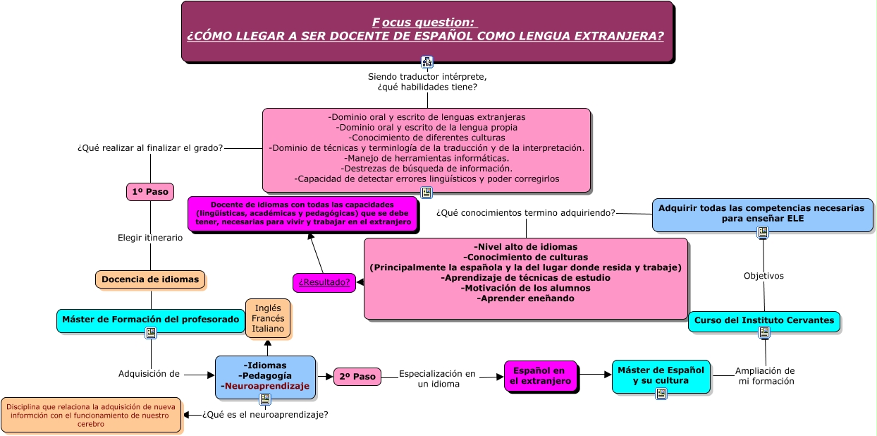 Este Cmap, tiene información relacionada con: Mapa conceptual Focus question TFC Aroa Gutiérrez, -Idiomas -Pedagogía -Neuroaprendizaje ¿Qué es el neuroaprendizaje? Disciplina que relaciona la adquisición de nueva informción con el funcionamiento de nuestro cerebro, 2º Paso Especialización en un idioma Español en el extranjero, Docencia de idiomas ???? Máster de Formación del profesorado, -Dominio oral y escrito de lenguas extranjeras -Dominio oral y escrito de la lengua propia -Conocimiento de diferentes culturas -Dominio de técnicas y terminlogía de la traducción y de la interpretación. -Manejo de herramientas informáticas. -Destrezas de búsqueda de información. -Capacidad de detectar errores lingüísticos y poder corregirlos ¿Qué realizar al finalizar el grado? 1º Paso, Focus question: ¿CÓMO LLEGAR A SER DOCENTE DE ESPAÑOL COMO LENGUA EXTRANJERA? Siendo traductor intérprete, ¿qué habilidades tiene? -Dominio oral y escrito de lenguas extranjeras -Dominio oral y escrito de la lengua propia -Conocimiento de diferentes culturas -Dominio de técnicas y terminlogía de la traducción y de la interpretación. -Manejo de herramientas informáticas. -Destrezas de búsqueda de información. -Capacidad de detectar errores lingüísticos y poder corregirlos, Máster de Español y su cultura Ampliación de mi formación Curso del Instituto Cervantes, Máster de Formación del profesorado Adquisición de -Idiomas -Pedagogía -Neuroaprendizaje, Español en el extranjero ???? Máster de Español y su cultura, 1º Paso Elegir itinerario Docencia de idiomas, Adquirir todas las competencias necesarias para enseñar ELE ¿Qué conocimientos termino adquiriendo? -Nivel alto de idiomas -Conocimiento de culturas (Principalmente la española y la del lugar donde resida y trabaje) -Aprendizaje de técnicas de estudio -Motivación de los alumnos -Aprender eneñando, -Idiomas -Pedagogía -Neuroaprendizaje ???? 2º Paso, Curso del Instituto Cervantes Objetivos Adquirir todas las competencias necesarias para enseñar ELE, ¿Resultado? ???? Docente de idiomas con todas las capacidades (lingüísticas, académicas y pedagógicas) que se debe tener, necesarias para vivir y trabajar en el extranjero, -Idiomas -Pedagogía -Neuroaprendizaje ???? Inglés Francés Italiano, -Nivel alto de idiomas -Conocimiento de culturas (Principalmente la española y la del lugar donde resida y trabaje) -Aprendizaje de técnicas de estudio -Motivación de los alumnos -Aprender eneñando ???? ¿Resultado?