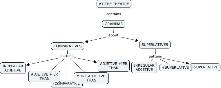 Este Cmap, tiene información relacionada con: AT THE TEATRE -AALEJANDRO, SUPERLATIVES pattens IRREGULAR ADJETIVE, SUPERLATIVES pattens +SUPERLATIVE, GRAMMAR about SUPERLATIVES, AT THE THEATRE contains GRAMMAR, SUPERLATIVES pattens -SUPERLATIVE, COMPARATIVES pattens ADJETIVE +IER THAN, COMPARATIVES pattens IRREGULAR ADJETIVE, COMPARATIVES pattens -COMPARATIVE, COMPARATIVES pattens MORE ADJETIVE THAN, COMPARATIVES pattens ADJETIVE + ER THAN, GRAMMAR about COMPARATIVES