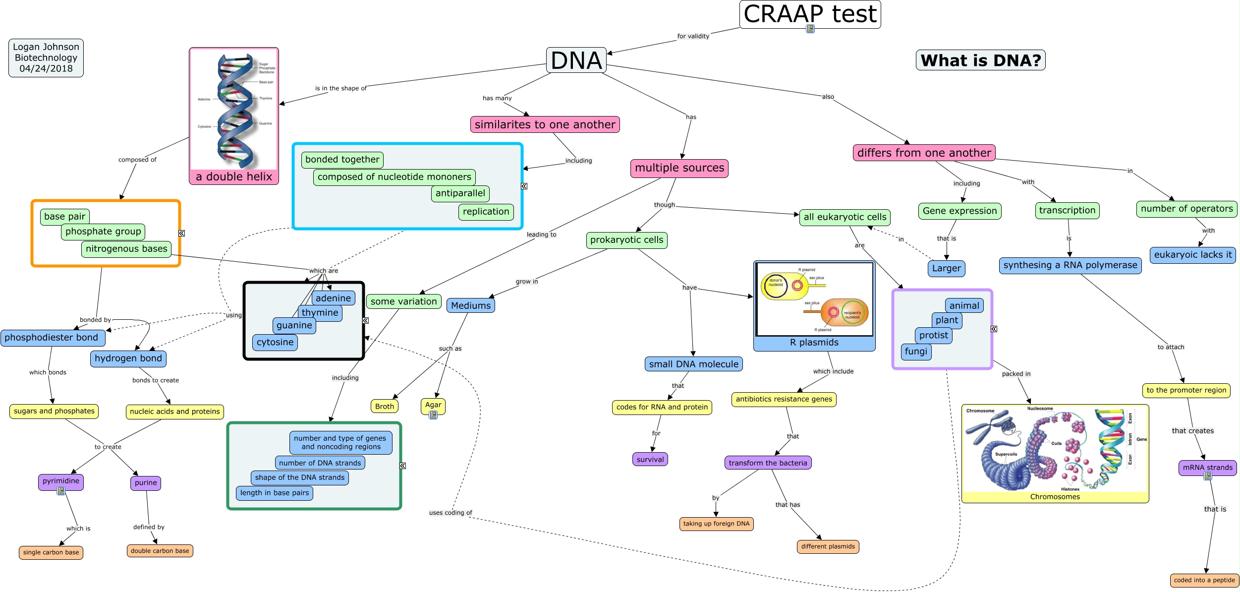 This Concept Map, created with IHMC CmapTools, has information related to: DNA cMap, ???? using phosphodiester bond, nitrogenous bases which are cytosine, nitrogenous bases which are adenine, multiple sources leading to some variation, ???? which are cytosine, synthesing a RNA polymerase to attach to the promoter region, ???? uses coding of ????, purine defined by double carbon base, phosphodiester bond which bonds sugars and phosphates, antibiotics resistance genes that transform the bacteria, ???? which are adenine, ???? which are thymine, pyrimidine which is single carbon base, multiple sources though prokaryotic cells, differs from one another with transcription, nitrogenous bases which are guanine, to the promoter region that creates mRNA strands, hydrogen bond bonds to create nucleic acids and proteins, nucleic acids and proteins to create pyrimidine, multiple sources though all eukaryotic cells