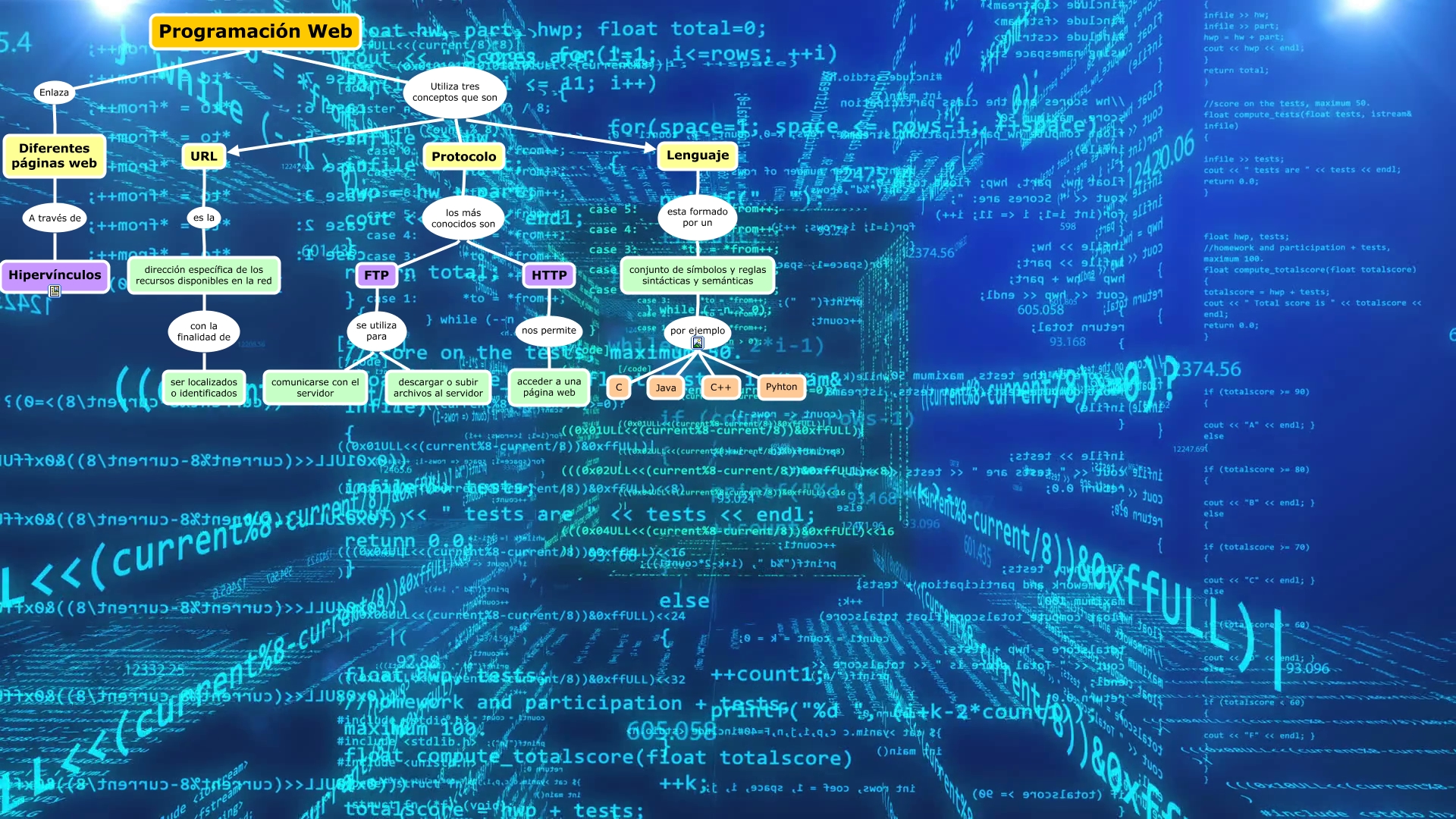 This Concept Map, created with IHMC CmapTools, has information related to: Programacion web, Programación Web Utiliza tres conceptos que son Protocolo, Lenguaje esta formado por un conjunto de símbolos y reglas sintácticas y semánticas, Protocolo los más conocidos son FTP, Programación Web Enlaza Diferentes páginas web, FTP se utiliza para comunicarse con el servidor, HTTP nos permite acceder a una página web, Protocolo los más conocidos son HTTP, dirección específica de los recursos disponibles en la red con la finalidad de ser localizados o identificados, Programación Web Utiliza tres conceptos que son Lenguaje, FTP se utiliza para descargar o subir archivos al servidor, conjunto de símbolos y reglas sintácticas y semánticas por ejemplo Java, Programación Web Utiliza tres conceptos que son URL, conjunto de símbolos y reglas sintácticas y semánticas por ejemplo C++, Diferentes páginas web A través de Hipervínculos, conjunto de símbolos y reglas sintácticas y semánticas por ejemplo C, conjunto de símbolos y reglas sintácticas y semánticas por ejemplo Pyhton, URL es la dirección específica de los recursos disponibles en la red