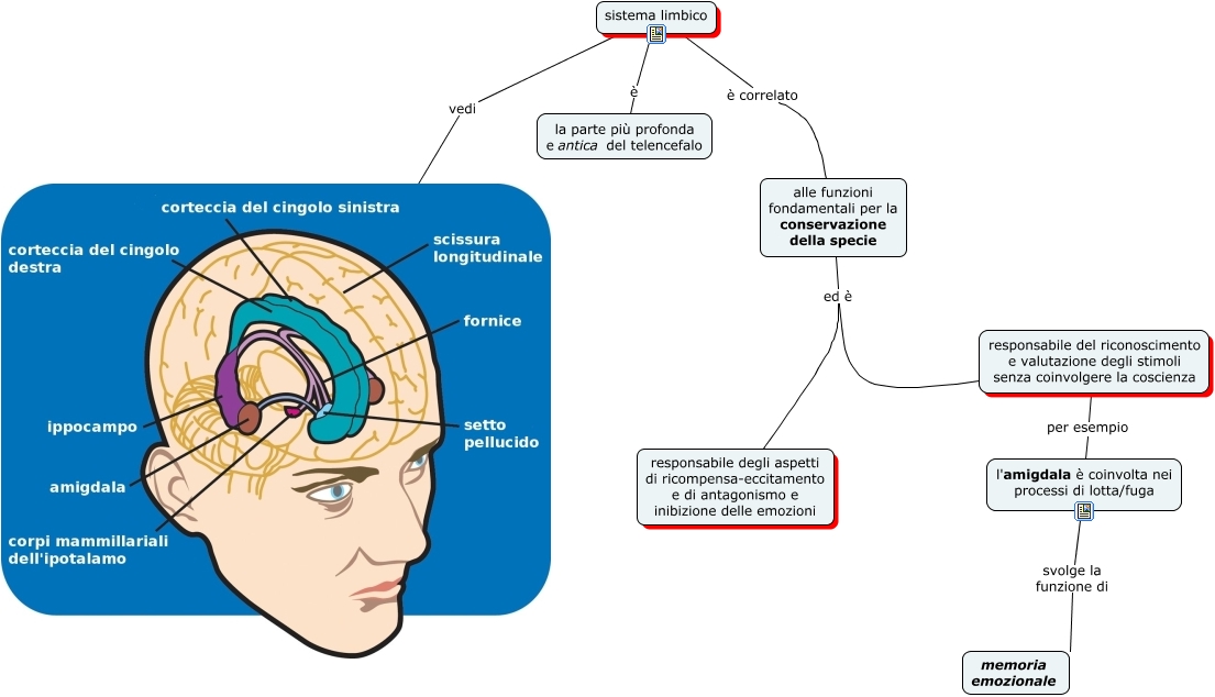 Questa Cmap, creata con IHMC CmapTools, contiene informazioni relative a: sistema limbico, sistema limbico è correlato alle funzioni fondamentali per la conservazione della specie, sistema limbico è la parte più profonda e antica del telencefalo, l'amigdala è coinvolta nei processi di lotta/fuga svolge la funzione di memoria emozionale, sistema limbico vedi, responsabile del riconoscimento e valutazione degli stimoli senza coinvolgere la coscienza per esempio l'amigdala è coinvolta nei processi di lotta/fuga, alle funzioni fondamentali per la conservazione della specie ed è responsabile del riconoscimento e valutazione degli stimoli senza coinvolgere la coscienza, alle funzioni fondamentali per la conservazione della specie ed è responsabile degli aspetti di ricompensa-eccitamento e di antagonismo e inibizione delle emozioni
