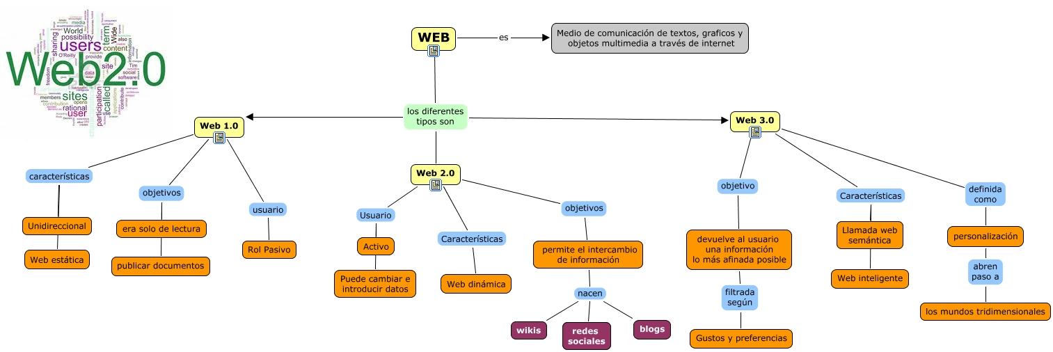 This Concept Map, created with IHMC CmapTools, has information related to: Web, WEB los diferentes tipos son Web 1.0, Web 3.0 objetivo devuelve al usuario una información lo más afinada posible, devuelve al usuario una información lo más afinada posible filtrada según Gustos y preferencias, Web 3.0 Características Web inteligente, Web 2.0 Usuario Puede cambiar e introducir datos, WEB los diferentes tipos son Web 3.0, Web 2.0 Usuario Activo, WEB los diferentes tipos son Web 2.0, WEB es Medio de comunicación de textos, graficos y objetos multimedia a través de internet, Web 1.0 usuario Rol Pasivo, permite el intercambio de información nacen blogs, Web 3.0 Características Llamada web semántica, Web 3.0 definida como personalización, Web 1.0 objetivos era solo de lectura, Web 2.0 objetivos permite el intercambio de información, Web 1.0 características Unidireccional, permite el intercambio de información nacen redes sociales, Web 2.0 Características Web dinámica, personalización abren paso a los mundos tridimensionales, permite el intercambio de información nacen wikis
