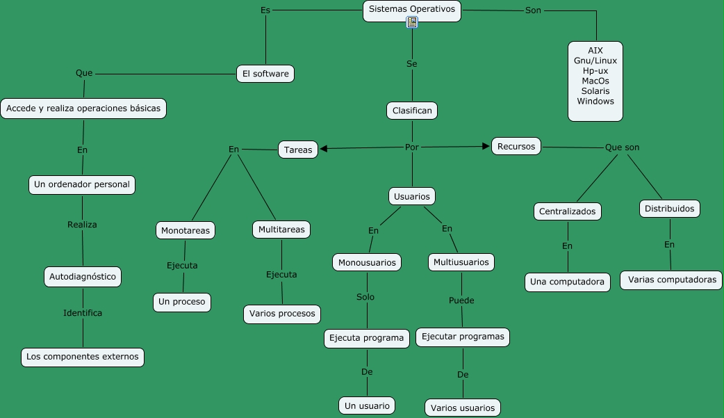 This Concept Map, created with IHMC CmapTools, has information related to: sistemas operativos, Tareas En Multitareas, Monotareas Ejecuta Un proceso, Multiusuarios Puede Ejecutar programas, Clasifican Por Usuarios, Autodiagnóstico Identifica Los componentes externos, Sistemas Operativos Se Clasifican, Ejecutar programas De Varios usuarios, Usuarios En Multiusuarios, Clasifican Por Recursos, Sistemas Operativos Es El software, Un ordenador personal Realiza Autodiagnóstico, Distribuidos En Varias computadoras, Sistemas Operativos Son AIX Gnu/Linux Hp-ux MacOs Solaris Windows, Centralizados En Una computadora, El software Que Accede y realiza operaciones básicas, Multitareas Ejecuta Varios procesos, Recursos Que son Centralizados, Clasifican Por Tareas, Usuarios En Monousuarios, Monousuarios Solo Ejecuta programa