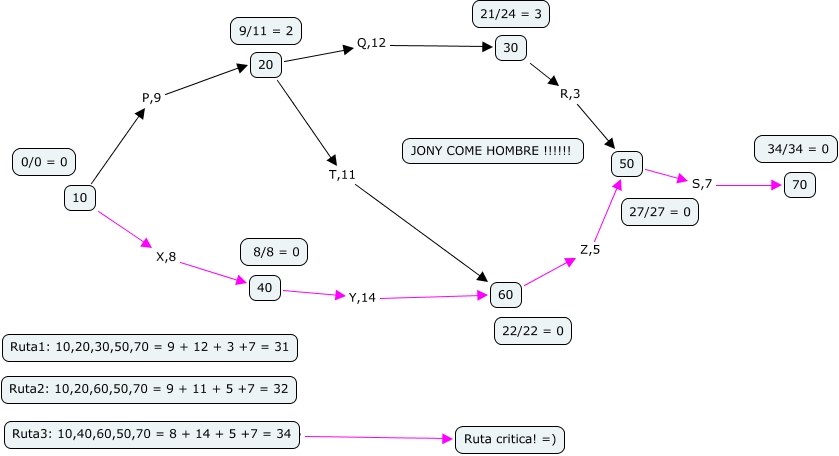 This Concept Map, created with IHMC CmapTools, has information related to: EjercicioC, 40 Y,14 60, 10 X,8 40, 50 S,7 70, 60 Z,5 50, 20 T,11 60, 30 R,3 50, 20 Q,12 30, 10 P,9 20, Ruta3: 10,40,60,50,70 = 8 + 14 + 5 +7 = 34 ???? Ruta critica! =)