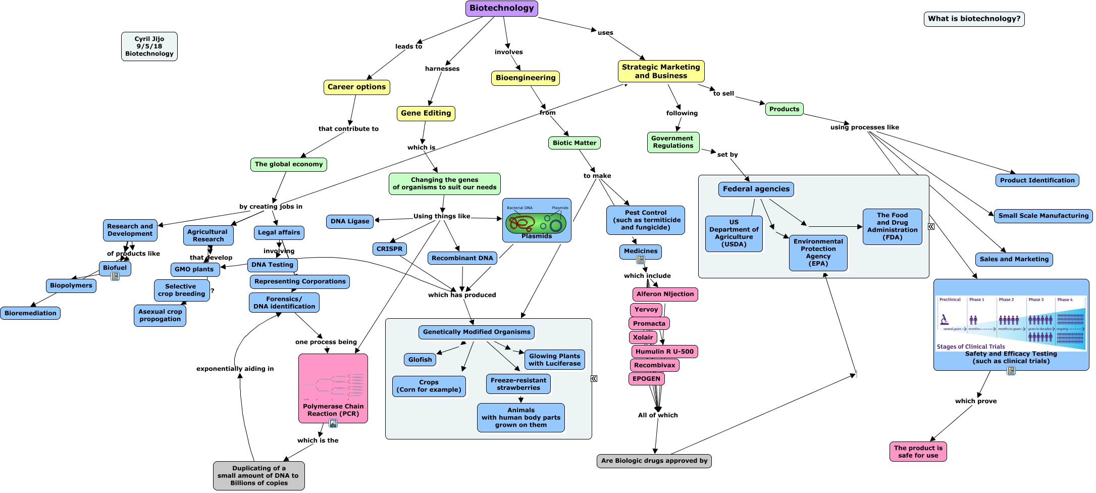This Concept Map, created with IHMC CmapTools, has information related to: Biotech Cmap, Plasmids which has produced GMO plants, Research and Development Bioremediation, Medicines which include Alferon Nljection, Biotechnology involves Bioengineering, Research and Development of products like Biofuel, Legal affairs ???? Forensics/ DNA identification, Research and Development ???? Biopolymers, Biotic Matter to make Pest Control (such as termiticide and fungicide), Are Biologic drugs approved by Environmental Protection Agency (EPA), CRISPR which has produced Genetically Modified Organisms, Products using processes like Small Scale Manufacturing, Products using processes like Sales and Marketing, Promacta All of which Are Biologic drugs approved by, Plasmids which has produced Genetically Modified Organisms, The global economy by creating jobs in Agricultural Research, The global economy by creating jobs in Agricultural Research, Medicines which include Promacta, Gene Editing which is Changing the genes of organisms to suit our needs, The global economy by creating jobs in Strategic Marketing and Business, Agricultural Research ???? Asexual crop propogation