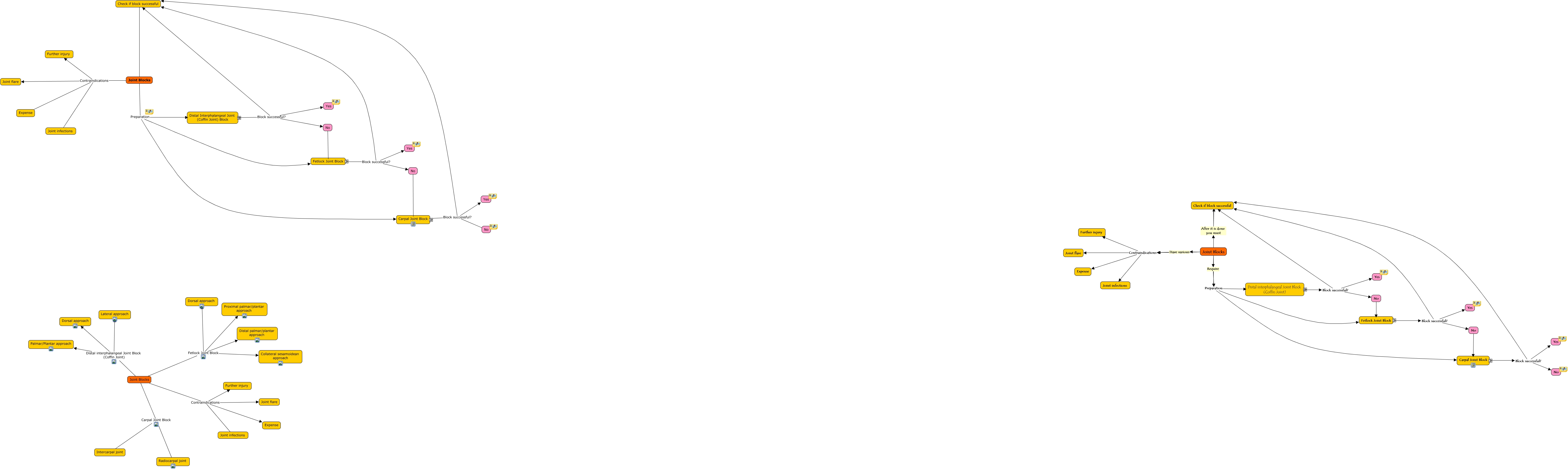 This Concept Map, created with IHMC CmapTools, has information related to: Joint blocks, Joint Blocks Contraindications Further injury , No Carpal Joint Block Radiocarpal joint, Joint Blocks Preparation Distal interphalangeal Joint Block (Coffin Joint), Joint Blocks Fetlock Joint Block Dorsal approach, No Carpal Joint Block Intercarpal joint, No Carpal Joint Block Radiocarpal joint, Distal interphalangeal Joint Block (Coffin Joint) Lateral approach, No Fetlock Joint Block Distal palmar/plantar approach, Carpal Joint Block Block successful? Yes, Joint Blocks ???? Check if block successful, No Carpal Joint Block Intercarpal joint, Fetlock Joint Block Block successful? Check if block successful, Carpal Joint Block Block successful? Yes, Joint Blocks Preparation Distal interphalangeal Joint Block (Coffin Joint), Joint Blocks Contraindications Joint flare, No Fetlock Joint Block Distal palmar/plantar approach, Distal Interphalangeal Joint (Coffin Joint) Block ???? Palmar/Plantar approach, No Fetlock Joint Block Proximal palmar/plantar approach, Joint Blocks Contraindications Expense, Fetlock Joint Block Block successful? No
