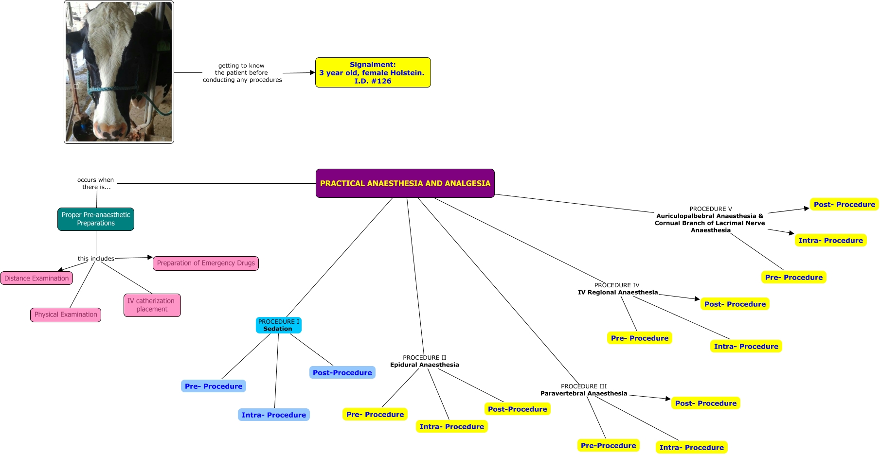 This Concept Map, created with IHMC CmapTools, has information related to: Lab 3- Practical Anaesthesia & Analgesia, Proper Pre-anaesthetic Preparations this includes IV catherization placement, Proper Pre-anaesthetic Preparations this includes Physical Examination, PRACTICAL ANAESTHESIA AND ANALGESIA PROCEDURE II Epidural Anaesthesia Post-Procedure, Proper Pre-anaesthetic Preparations this includes Distance Examination, PRACTICAL ANAESTHESIA AND ANALGESIA PROCEDURE III Paravertebral Anaesthesia Pre-Procedure, PRACTICAL ANAESTHESIA AND ANALGESIA PROCEDURE IV IV Regional Anaesthesia Post- Procedure, PRACTICAL ANAESTHESIA AND ANALGESIA PROCEDURE III Paravertebral Anaesthesia Post- Procedure, PRACTICAL ANAESTHESIA AND ANALGESIA PROCEDURE II Epidural Anaesthesia Pre- Procedure, getting to know the patient before conducting any procedures Signalment: 3 year old, female Holstein. I.D. #126, PRACTICAL ANAESTHESIA AND ANALGESIA PROCEDURE II Epidural Anaesthesia Intra- Procedure, PRACTICAL ANAESTHESIA AND ANALGESIA occurs when there is... Proper Pre-anaesthetic Preparations, PRACTICAL ANAESTHESIA AND ANALGESIA PROCEDURE V Auriculopalbebral Anaesthesia & Cornual Branch of Lacrimal Nerve Anaesthesia Post- Procedure, PRACTICAL ANAESTHESIA AND ANALGESIA PROCEDURE I Sedation Intra- Procedure, PRACTICAL ANAESTHESIA AND ANALGESIA PROCEDURE IV IV Regional Anaesthesia Intra- Procedure, Proper Pre-anaesthetic Preparations this includes Preparation of Emergency Drugs, PRACTICAL ANAESTHESIA AND ANALGESIA PROCEDURE I Sedation Post-Procedure, PRACTICAL ANAESTHESIA AND ANALGESIA PROCEDURE III Paravertebral Anaesthesia Intra- Procedure, PRACTICAL ANAESTHESIA AND ANALGESIA PROCEDURE I Sedation Pre- Procedure, PRACTICAL ANAESTHESIA AND ANALGESIA PROCEDURE V Auriculopalbebral Anaesthesia & Cornual Branch of Lacrimal Nerve Anaesthesia Pre- Procedure, PRACTICAL ANAESTHESIA AND ANALGESIA PROCEDURE V Auriculopalbebral Anaesthesia & Cornual Branch of Lacrimal Nerve Anaesthesia Intra- Procedure