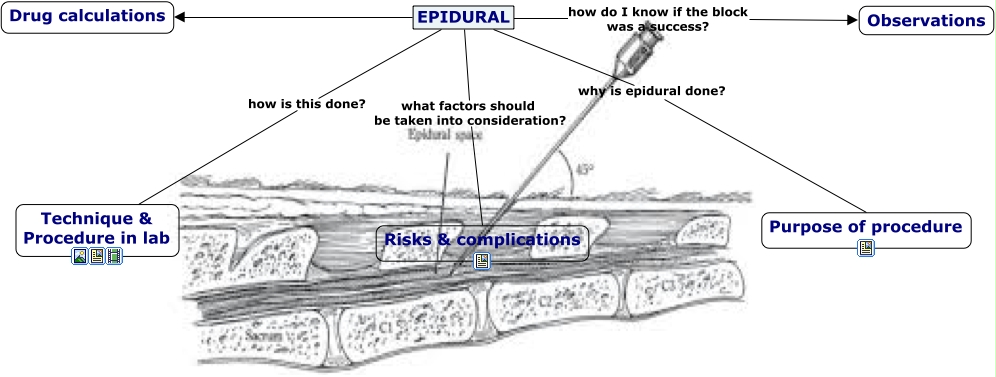 This Concept Map, created with IHMC CmapTools, has information related to: Epidural, EPIDURAL why is epidural done? Purpose of procedure, EPIDURAL how do I know if the block was a success? Observations, EPIDURAL how is this done? Technique & Procedure in lab, EPIDURAL what factors should be taken into consideration? Risks & complications, EPIDURAL Drug calculations