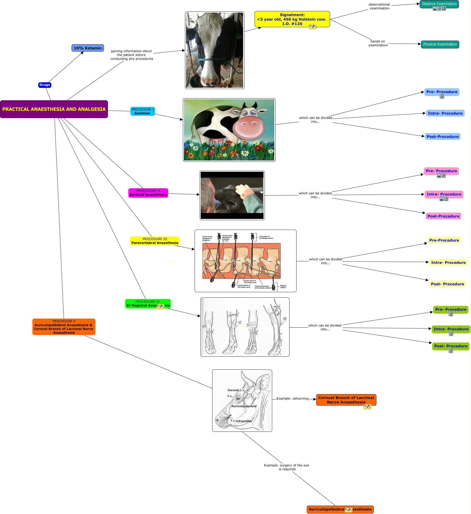This Concept Map, created with IHMC CmapTools, has information related to: Untitled, PRACTICAL ANAESTHESIA AND ANALGESIA gaining information about the patient before conducting any procedures, PRACTICAL ANAESTHESIA AND ANALGESIA PROCEDURE II Epidural Anaesthesia, PRACTICAL ANAESTHESIA AND ANALGESIA PROCEDURE III Paravertebral Anaesthesia ????, Signalment: ɛ year old, 450 kg Holstein cow. I.D. #126 observational examination Distance Examination, which can be divided into... Post-Procedure, Signalment: ɛ year old, 450 kg Holstein cow. I.D. #126 hands on examination Physical Examination, ???? which can be divided into... Pre-Procedure, which can be divided into... Pre- Procedure, ???? which can be divided into... Post- Procedure, Example: surgery of the eye is required Auriculopalbebral Anaesthesia, Signalment: ɛ year old, 450 kg Holstein cow. I.D. #126, ???? which can be divided into... Intra- Procedure, ???? which can be divided into... Intra- Procedure, which can be divided into... Intra- Procedure, which can be divided into... Pre- Procedure, ???? which can be divided into... Pre- Procedure, PRACTICAL ANAESTHESIA AND ANALGESIA Drugs 10% Ketamin, which can be divided into... Intra- Procedure, which can be divided into... Post-Procedure, PRACTICAL ANAESTHESIA AND ANALGESIA PROCEDURE IV IV Regional Anaesthesia ????