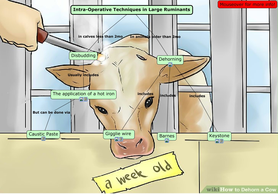 This Concept Map, created with IHMC CmapTools, has information related to: Intra-Op (LARGE R), Dehorning includes Gigglie wire, Dehorning includes Keystone, The application of a hot iron But can be done via Caustic Paste, Dehorning includes Barnes, Intra-Operative Techniques in Large Ruminants In animals older than 2mo Dehorning, Disbudding Usually includes The application of a hot iron, Intra-Operative Techniques in Large Ruminants in calves less than 2mo Disbudding