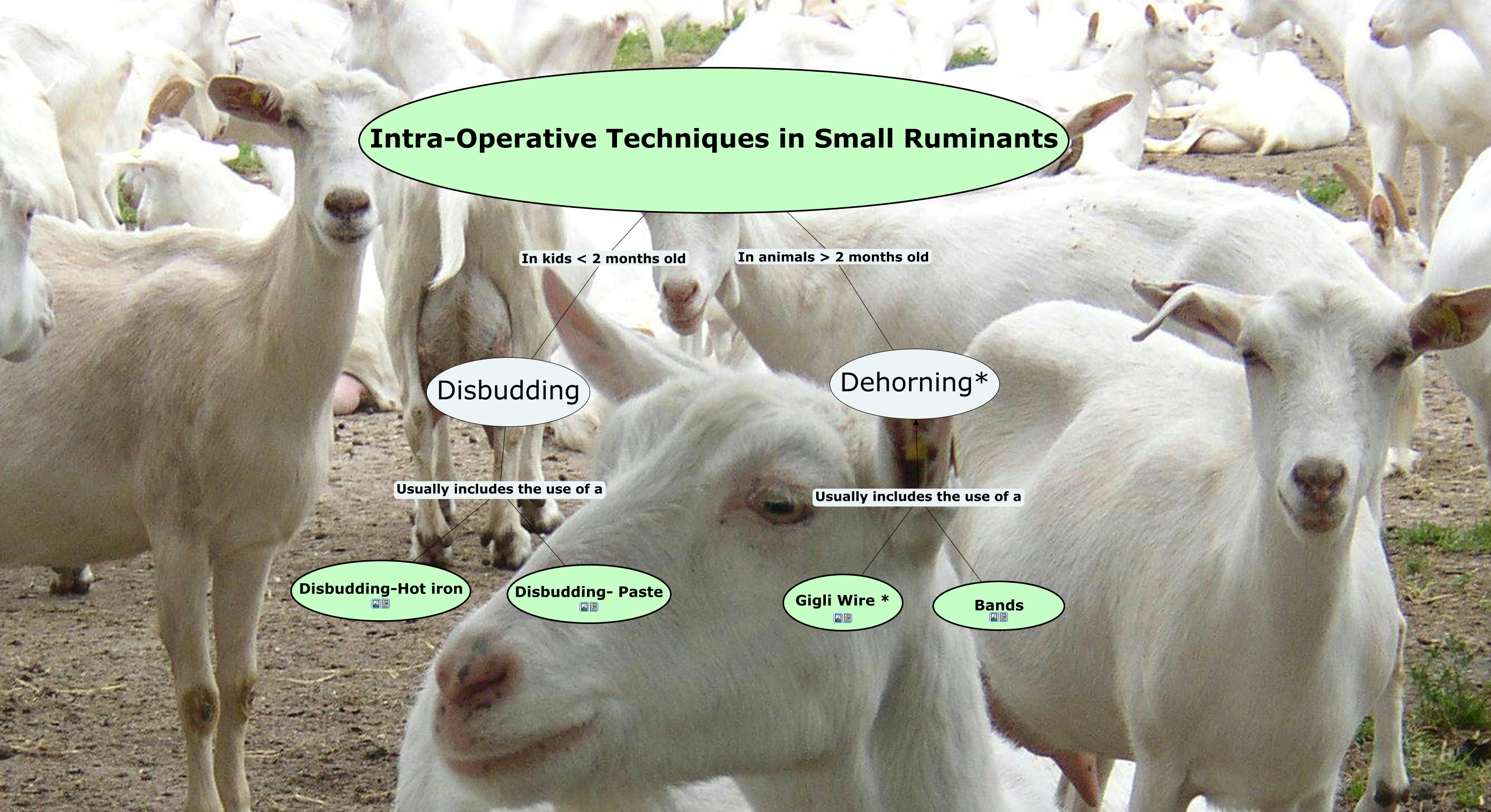 This Concept Map, created with IHMC CmapTools, has information related to: Intra-Op Small ruminants Dehorning & Disbudding, Intra-Operative Techniques in Small Ruminants In kids < 2 months old Disbudding, Disbudding- Paste Usually includes the use of a Disbudding-Hot iron, Disbudding Usually includes the use of a Disbudding-Hot iron, Intra-Operative Techniques in Small Ruminants In animals > 2 months old Dehorning*, Bands Usually includes the use of a Dehorning*, Gigli Wire * Usually includes the use of a Dehorning*