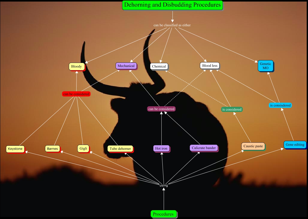 This Concept Map, created with IHMC CmapTools, has information related to: Classification of dehorning, Keystone can be considered Mechanical, Hot iron can be considered Blood less, Keystone can be considered Bloody, Procedures using Caustic paste, Tube dehorner can be considered Bloody, Dehorning and Disbudding Procedures can be classified as either Blood less, Dehorning and Disbudding Procedures can be classified as either Bloody, Dehorning and Disbudding Procedures can be classified as either Genetic MO, Dehorning and Disbudding Procedures can be classified as either Chemical, Gigli can be considered Mechanical, Procedures using Keystone, Barnes can be considered Bloody, Gene editing is consisdered Blood less, Gene editing is consisdered Genetic MO, Tube dehorner can be considered Mechanical, Procedures using Hot iron, Procedures using Calicrate bander, Hot iron can be considered Mechanical, Calicrate bander can be considered Blood less, Procedures using Gigli