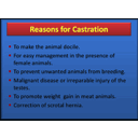 Advantages + Disadvantages of Castration Techniques.jpg Advantages and Disadvantages of Castration.jpg Ages For Castration.jpg Area preparation.jpg Banamine.jpg BCS Chart.png Benefits of budizzo.PNG Boar anatomy.PNG budizzo.gif Budzzio technique.PNG Burdizzo Castrator.jpg Calicrate Bander.jpg Castration equipment.jpg Castration in mature pigs.PNG Castration in pigs.PNG Chute restraint.jpg Complications.PNG Considerations for castration in cattle.PNG Considerations for castration in goats.PNG Considerations for castration in pigs.PNG Considerations for castration in sheep.PNG Elastrator.jpg Elastrator placement.PNG Emasculator.jpg Emasculator technique.PNG Henderson's tool.jpg Immunocastration procedure.PNG Ketamine.jpg Lidocaine.jpg Newberry tool.jpg Newberry tool cut.jpg nut to nut.jpg Open Castration.MP4 Pen-strep.JPG post op.jpeg Restraining hind legs with rope tie.jpg Scrotal incision.MP4 Summary.MP4 testicle_anatomy.png Testicular-conformation.jpg Traction technique.PNG Treatment.PNG Types of Emasculators.jpg Why to castrate an animal.jpg Xylazine.jpg