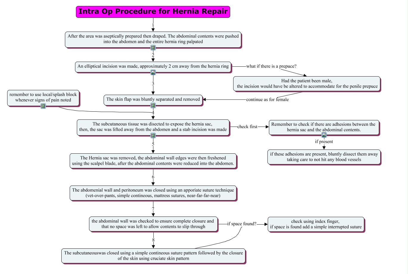 This Concept Map, created with IHMC CmapTools, has information related to: Intra Op, The abdomenial wall and peritoneum was closed using an apporiate suture technique (vet-over-pants, simple contineous, mattress sutures, near-far-far-near) 7 the abdominal wall was checked to ensure complete closure and that no space was left to allow contents to slip through, The skin flap was bluntly separated and removed 4 The subcutaneous tissue was disected to expose the hernia sac, then, the sac was lifted away from the abdomen and a stab incision was made, An elliptical incision was made, approximately 2 cm away from the hernia ring what if there is a prepuce? Had the patient been male, the incision would have be altered to accommodate for the penile prepuce, After the area was aseptically prepared then draped. The abdominal contents were pushed into the abdomen and the entire hernia ring palpated 2 An elliptical incision was made, approximately 2 cm away from the hernia ring, Intra Op Procedure for Hernia Repair 1 After the area was aseptically prepared then draped. The abdominal contents were pushed into the abdomen and the entire hernia ring palpated, the abdominal wall was checked to ensure complete closure and that no space was left to allow contents to slip through 8 The subcutaneouswas closed using a simple contineous suture pattern followed by the closure of the skin using cruciate skin pattern, remember to use local/splash block whenever signs of pain noted 4 The subcutaneous tissue was disected to expose the hernia sac, then, the sac was lifted away from the abdomen and a stab incision was made, The subcutaneouswas closed using a simple contineous suture pattern followed by the closure of the skin using cruciate skin pattern if space found? check using index finger, if space is found add a simple interrupted suture, The subcutaneous tissue was disected to expose the hernia sac, then, the sac was lifted away from the abdomen and a stab incision was made 5 The Hernia sac was removed, the abdominal wall edges were then freshened using the scalpel blade, after the abdominal contents were reduced into the abdomen., Had the patient been male, the incision would have be altered to accommodate for the penile prepuce continue as for female The skin flap was bluntly separated and removed, the abdominal wall was checked to ensure complete closure and that no space was left to allow contents to slip through if space found? check using index finger, if space is found add a simple interrupted suture, An elliptical incision was made, approximately 2 cm away from the hernia ring 3 The skin flap was bluntly separated and removed, Remember to check if there are adhesions between the hernia sac and the abdominal contents. if present if these adhesions are present, bluntly dissect them away taking care to not hit any blood vessels, The Hernia sac was removed, the abdominal wall edges were then freshened using the scalpel blade, after the abdominal contents were reduced into the abdomen. 6 The abdomenial wall and peritoneum was closed using an apporiate suture technique (vet-over-pants, simple contineous, mattress sutures, near-far-far-near), The subcutaneous tissue was disected to expose the hernia sac, then, the sac was lifted away from the abdomen and a stab incision was made check first Remember to check if there are adhesions between the hernia sac and the abdominal contents.