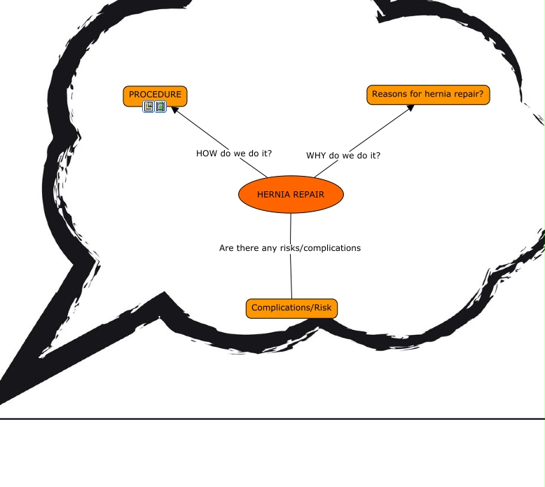 This Concept Map, created with IHMC CmapTools, has information related to: Reasons for Hernia Repair, HERNIA REPAIR HOW do we do it? PROCEDURE, HERNIA REPAIR WHY do we do it? Reasons for hernia repair?, HERNIA REPAIR Are there any risks/complications Complications/Risk