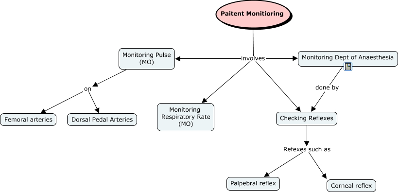 This Concept Map, created with IHMC CmapTools, has information related to: Patient Monitoring, Checking Reflexes Refexes such as Corneal reflex, Paitent Monitioring involves Monitoring Dept of Anaesthesia, Checking Reflexes Refexes such as Palpebral reflex, Paitent Monitioring involves Checking Reflexes, Monitoring Pulse (MO) on Dorsal Pedal Arteries, Paitent Monitioring involves Monitoring Respiratory Rate (MO), Monitoring Dept of Anaesthesia done by Checking Reflexes, Paitent Monitioring involves Monitoring Pulse (MO), Monitoring Pulse (MO) on Femoral arteries