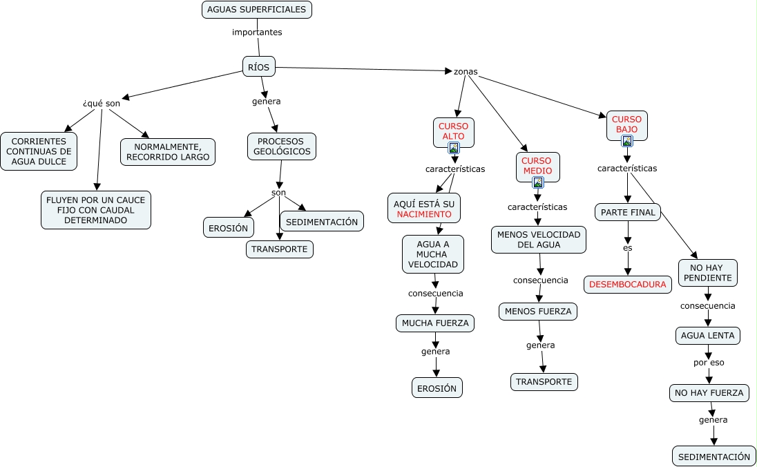 Este Cmap, tiene información relacionada con: AGUAS SUPERFICIALES, PROCESOS GEOLÓGICOS son TRANSPORTE, CURSO BAJO características PARTE FINAL, RÍOS ¿qué son CORRIENTES CONTINUAS DE AGUA DULCE, PROCESOS GEOLÓGICOS son EROSIÓN, RÍOS genera PROCESOS GEOLÓGICOS, RÍOS zonas CURSO BAJO, RÍOS zonas CURSO MEDIO, CURSO ALTO características AQUÍ ESTÁ SU NACIMIENTO, CURSO MEDIO características MENOS VELOCIDAD DEL AGUA, RÍOS ¿qué son NORMALMENTE, RECORRIDO LARGO, PARTE FINAL es DESEMBOCADURA, MENOS FUERZA genera TRANSPORTE, AGUA LENTA por eso NO HAY FUERZA, CURSO BAJO características NO HAY PENDIENTE, NO HAY PENDIENTE consecuencia AGUA LENTA, NO HAY FUERZA genera SEDIMENTACIÓN, PROCESOS GEOLÓGICOS son SEDIMENTACIÓN, AGUAS SUPERFICIALES importantes RÍOS, MUCHA FUERZA genera EROSIÓN, CURSO ALTO características AGUA A MUCHA VELOCIDAD