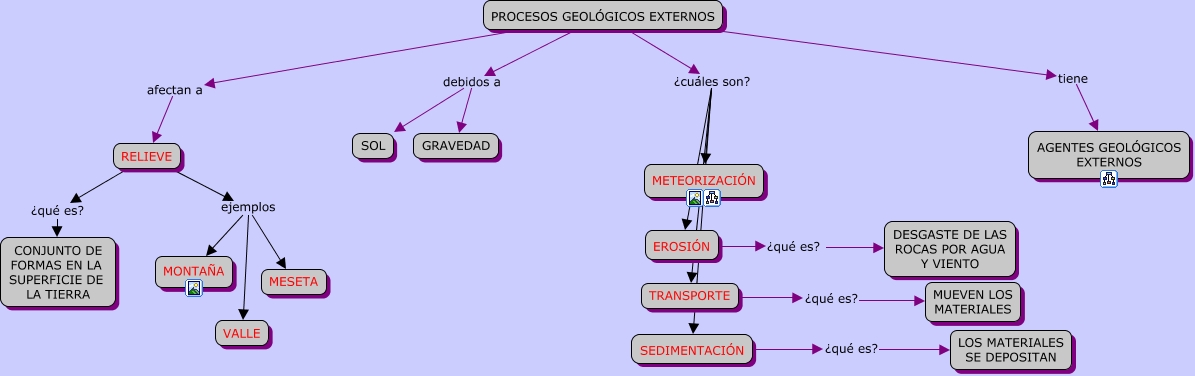 Este Cmap, tiene información relacionada con: PROCESOS GEOLÓGICOS EXTERNOS - PIEDRABUENA, TRANSPORTE ¿qué es? MUEVEN LOS MATERIALES, PROCESOS GEOLÓGICOS EXTERNOS debidos a SOL, PROCESOS GEOLÓGICOS EXTERNOS tiene AGENTES GEOLÓGICOS EXTERNOS, PROCESOS GEOLÓGICOS EXTERNOS ¿cuáles son? METEORIZACIÓN, RELIEVE ejemplos MESETA, PROCESOS GEOLÓGICOS EXTERNOS ¿cuáles son? SEDIMENTACIÓN, PROCESOS GEOLÓGICOS EXTERNOS ¿cuáles son? EROSIÓN, RELIEVE ejemplos MONTAÑA, SEDIMENTACIÓN ¿qué es? LOS MATERIALES SE DEPOSITAN, RELIEVE ¿qué es? CONJUNTO DE FORMAS EN LA SUPERFICIE DE LA TIERRA, PROCESOS GEOLÓGICOS EXTERNOS ¿cuáles son? TRANSPORTE, RELIEVE ejemplos VALLE, EROSIÓN ¿qué es? DESGASTE DE LAS ROCAS POR AGUA Y VIENTO, PROCESOS GEOLÓGICOS EXTERNOS afectan a RELIEVE, PROCESOS GEOLÓGICOS EXTERNOS debidos a GRAVEDAD