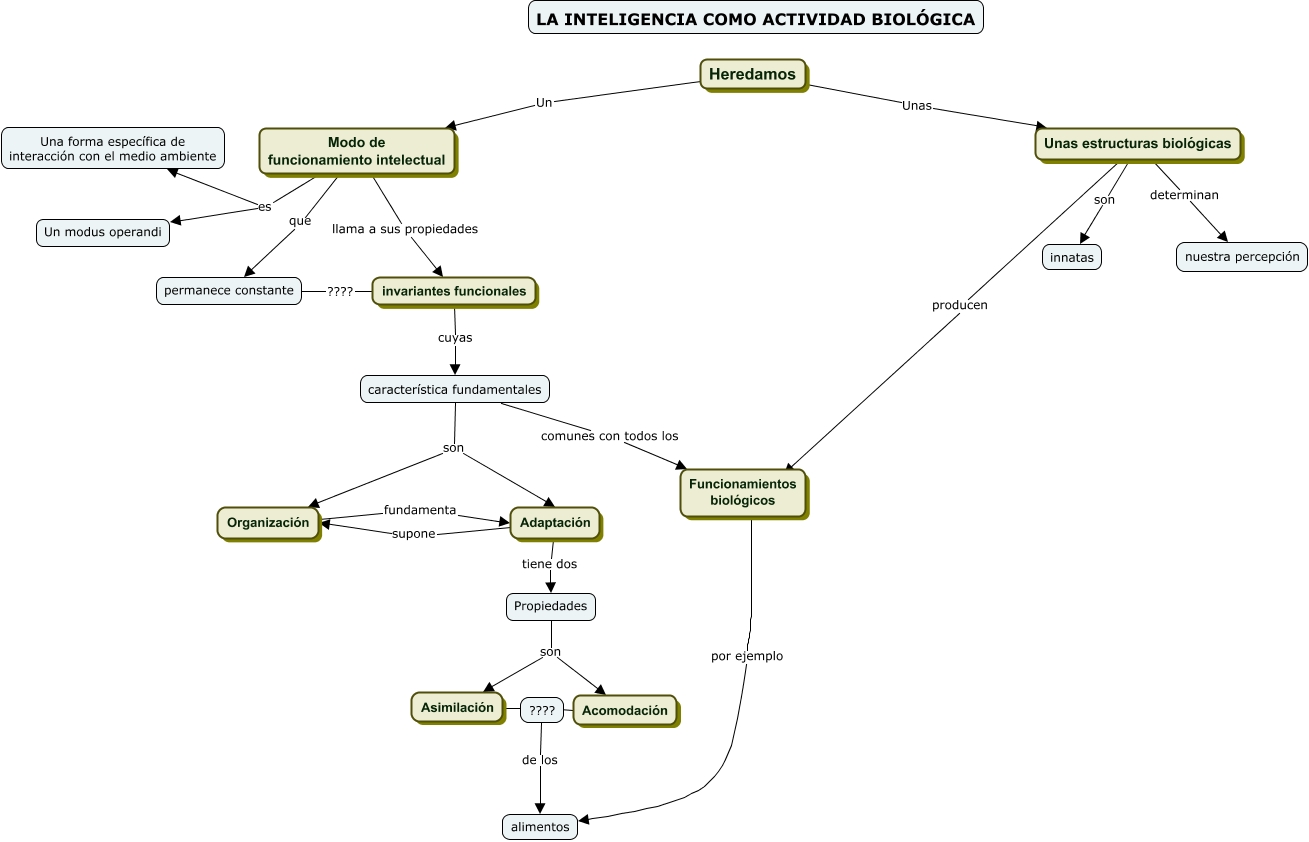 Este Cmap, tiene información relacionada con: La inteligencia como actividad biologica, ???? de los alimentos, Adaptación tiene dos Propiedades, Modo de funcionamiento intelectual es Un modus operandi, permanece constante ???? invariantes funcionales, invariantes funcionales cuyas característica fundamentales, característica fundamentales comunes con todos los Funcionamientos biológicos, Unas estructuras biológicas son innatas, Heredamos Unas Unas estructuras biológicas, característica fundamentales son Organización, característica fundamentales son Adaptación, Modo de funcionamiento intelectual llama a sus propiedades invariantes funcionales, Adaptación supone Organización, Unas estructuras biológicas determinan nuestra percepción, Asimilación y Acomodación, Modo de funcionamiento intelectual es Una forma específica de interacción con el medio ambiente, Propiedades son Asimilación, Unas estructuras biológicas producen ????, Modo de funcionamiento intelectual que permanece constante, Propiedades son Acomodación, Organización fundamenta Adaptación