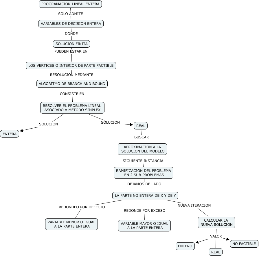 This Concept Map, created with IHMC CmapTools, has information related to: Programacion Lineal entera (Seba Diaz), VARIABLES DE DECISION ENTERA DONDE SOLUCION FINITA, RAMIFICACION DEL PROBLEMA EN 2 SUB-PROBLEMAS DEJAMOS DE LADO LA PARTE NO ENTERA DE X Y DE Y, CALCULAR LA NUEVA SOLUCION VALOR REAL, ALGORITMO DE BRANCH AND BOUND CONSISTE EN RESOLVER EL PROBLEMA LINEAL ASOCIADO A METODO SIMPLEX, CALCULAR LA NUEVA SOLUCION VALOR ENTERO, REAL BUSCAR APROXIMACION A LA SOLUCION DEL MODELO, PROGRAMACION LINEAL ENTERA SOLO ADMITE VARIABLES DE DECISION ENTERA, RESOLVER EL PROBLEMA LINEAL ASOCIADO A METODO SIMPLEX SOLUCION ENTERA, LA PARTE NO ENTERA DE X Y DE Y NUEVA ITERACION CALCULAR LA NUEVA SOLUCION, LOS VERTICES O INTERIOR DE PARTE FACTIBLE RESOLUCION MEDIANTE ALGORITMO DE BRANCH AND BOUND, CALCULAR LA NUEVA SOLUCION VALOR NO FACTIBLE, LA PARTE NO ENTERA DE X Y DE Y REDONDEO POR DEFECTO VARIABLE MENOR O IGUAL A LA PARTE ENTERA, LA PARTE NO ENTERA DE X Y DE Y REDONDE POR EXCESO VARIABLE MAYOR O IGUAL A LA PARTE ENTERA, SOLUCION FINITA PUEDEN ESTAR EN LOS VERTICES O INTERIOR DE PARTE FACTIBLE, RESOLVER EL PROBLEMA LINEAL ASOCIADO A METODO SIMPLEX SOLUCION REAL, APROXIMACION A LA SOLUCION DEL MODELO SIGUIENTE INSTANCIA RAMIFICACION DEL PROBLEMA EN 2 SUB-PROBLEMAS
