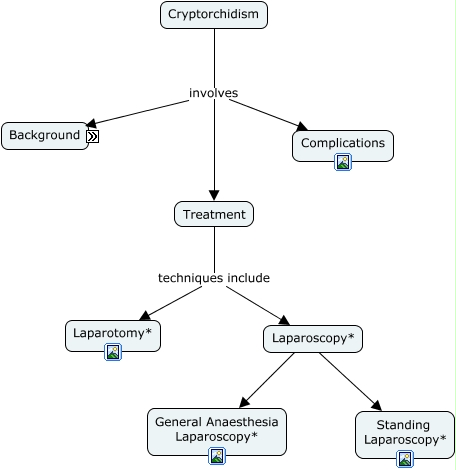 This Concept Map, created with IHMC CmapTools, has information related to: Cryptorchidism, Background* includes Breed Disposition*, Cryptorchidism involves Complications, Background* includes Aetiology*, Treatment techniques include Laparotomy*, Laparoscopy* ???? Standing Laparoscopy*, Cryptorchidism involves Treatment, Cryptorchidism involves Background*, Types* are categorised by # retained*, Types* are categorised by location of testicle*, Background* includes Anatomy*, Treatment techniques include Laparoscopy*, Background* includes Types*, Laparoscopy* ???? General Anaesthesia Laparoscopy*