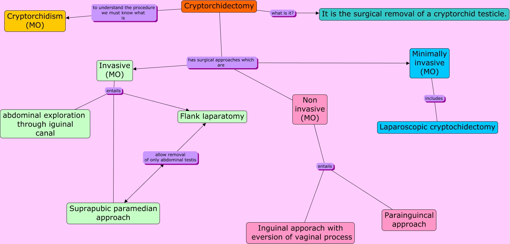 This Concept Map, created with IHMC CmapTools, has information related to: Cryptochidectomies, Invasive (MO) entails Flank laparatomy, Suprapubic paramedian approach allow removal of only abdominal testis Flank laparatomy, Cryptorchidectomy to understand the procedure we must know what is Cryptorchidism (MO), Non invasive (MO) entails Parainguincal approach, Cryptorchidectomy has surgical approaches which are Minimally invasive (MO), Cryptorchidectomy what is it? It is the surgical removal of a cryptorchid testicle., Non invasive (MO) entails Inguinal apporach with eversion of vaginal process, Minimally invasive (MO) includes Laparoscopic cryptochidectomy, Invasive (MO) entails Suprapubic paramedian approach, Invasive (MO) entails abdominal exploration through iguinal canal, Cryptorchidectomy has surgical approaches which are Non invasive (MO), Cryptorchidectomy has surgical approaches which are Invasive (MO)