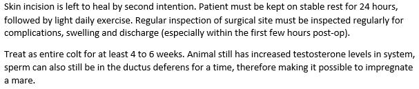 Aetiology.jpg Anatomy.jpg Caslick.jpg Caslick2.png Caslick procedure.url Caslick process.png closed castration video.url Complications.jpg Complications Eventration.png Complications General 1.png Complications Haemorrhage.png Complications Infection.png Complications Oedema.png Complications Protrusion.png Emasculator.jpg Equine Teste (Intact).jpg Gen Anaesthesia Anaesthesia.png Gen Anaesthesia Considerations.png Gen Lap.jpg Halter on Horse Head.jpg horse balls.jpg Laparotomy.jpg Nut to Nut.jpg Open Procedure pt 1.png Open Procedure pt 2.png Open Procedure pt 3.png Post-Op considerations.png Procedure pt 1.png Rope Twitch.jpg Standing Anaesthesia.png Standing Considerations.png Stand Lap.jpg TDProcess.jpg Testicular descent.jpg