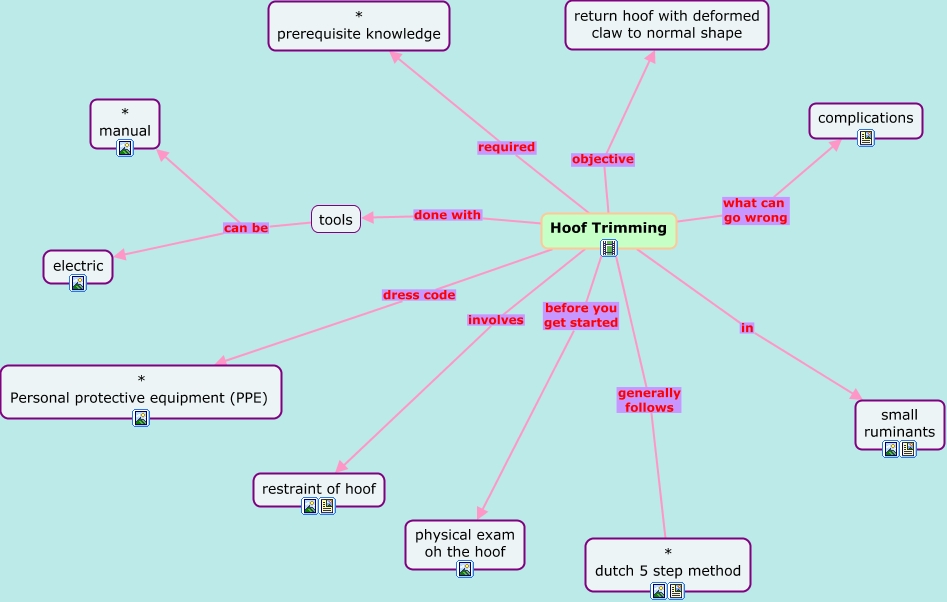 This Concept Map, created with IHMC CmapTools, has information related to: Hoof Triming, Hoof Trimming involves restraint of hoof, Hoof Trimming what can go wrong complications, Hoof Trimming in small ruminants, Hoof Trimming generally follows * dutch 5 step method, Hoof Trimming before you get started physical exam oh the hoof, tools can be electric, tools can be * manual, Hoof Trimming dress code * Personal protective equipment (PPE), Hoof Trimming required * prerequisite knowledge, Hoof Trimming done with tools, Hoof Trimming objective return hoof with deformed claw to normal shape