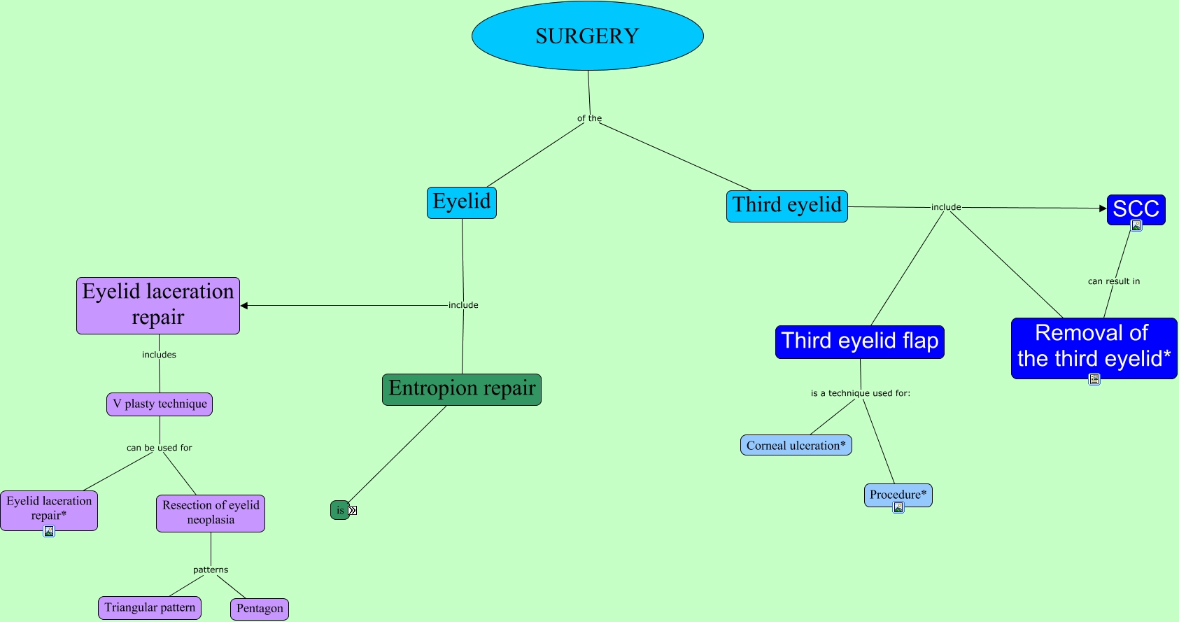 This Concept Map, created with IHMC CmapTools, has information related to: Eyelid and third eyelid surgery, Sheep & sometimes goats it is heritable (sheep), Third eyelid include SCC, SURGERY of the Eyelid, V plasty technique can be used for Eyelid laceration repair*, Third eyelid flap is a technique used for: Corneal ulceration*, Entropion repair Entropion is common in Sheep & sometimes goats, Eyelid include Eyelid laceration repair, irritation and ulceration of the cornea How to correct? Correction, Correction involves Surgical repair e.g. Hotz-Celsus procedure*, Correction involves Eyelid tacking*, V plasty technique can be used for Resection of eyelid neoplasia, Sheep & sometimes goats it is the inversion of the eyelid (usually the lower eyelid), Surgical repair e.g. Hotz-Celsus procedure* how to do it? Procedure, Sheep & sometimes goats and rarely seen in other farm animals (cattle, pigs), Eyelid laceration repair includes V plasty technique, Eyelid include Entropion repair, Correction involves Use of antibiotics* ("farmer's approach"), the inversion of the eyelid (usually the lower eyelid) leading to irritation and ulceration of the cornea, Resection of eyelid neoplasia patterns Pentagon, Third eyelid include Removal of the third eyelid*