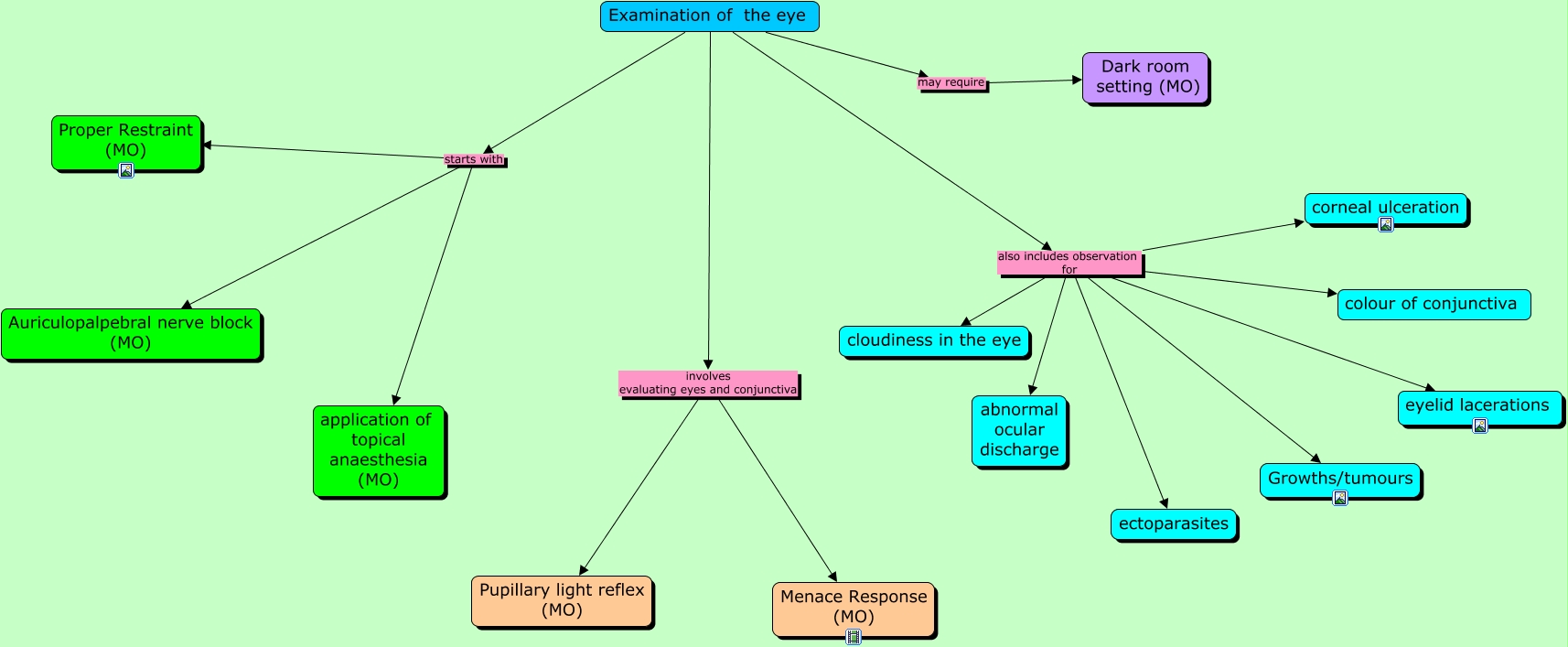 This Concept Map, created with IHMC CmapTools, has information related to: examination of eye, Examination of the eye involves evaluating eyes and conjunctiva Pupillary light reflex (MO), Examination of the eye starts with application of topical anaesthesia (MO), Examination of the eye also includes observation for ectoparasites, Examination of the eye starts with Proper Restraint (MO), Examination of the eye also includes observation for corneal ulceration, Examination of the eye also includes observation for cloudiness in the eye, Examination of the eye also includes observation for eyelid lacerations, Examination of the eye also includes observation for abnormal ocular discharge, Examination of the eye also includes observation for Growths/tumours, Examination of the eye may require Dark room setting (MO), Examination of the eye starts with Auriculopalpebral nerve block (MO), Examination of the eye also includes observation for colour of conjunctiva, Examination of the eye involves evaluating eyes and conjunctiva Menace Response (MO)