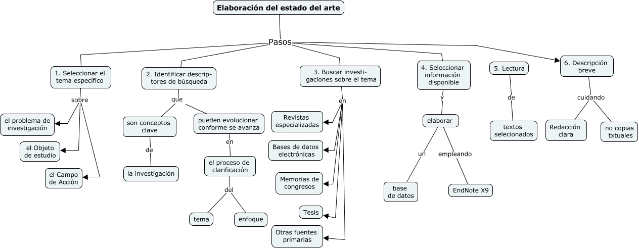 Este Cmap, tiene información relacionada con: Pasos del Estado del Arte, elaborar un base de datos, 6. Descripción breve cuidando Redacción clara, 1. Seleccionar el tema específico sobre el Campo de Acción, son conceptos clave de la investigación, Elaboración del estado del arte Pasos 1. Seleccionar el tema específico, 2. Identificar descrip- tores de búsqueda que son conceptos clave, 3. Buscar investi- gaciones sobre el tema en Otras fuentes primarias, 1. Seleccionar el tema específico sobre el problema de investigación, elaborar empleando EndNote X9, 6. Descripción breve cuidando no copias txtuales, Elaboración del estado del arte Pasos 2. Identificar descrip- tores de búsqueda, 3. Buscar investi- gaciones sobre el tema en Memorias de congresos, 1. Seleccionar el tema específico sobre el Objeto de estudio, pueden evolucionar conforme se avanza en el proceso de clarificación, 5. Lectura de textos selecionados, 3. Buscar investi- gaciones sobre el tema en Revistas especializadas, Elaboración del estado del arte Pasos 4. Seleccionar información disponible, el proceso de clarificación del tema, 2. Identificar descrip- tores de búsqueda que pueden evolucionar conforme se avanza, Elaboración del estado del arte Pasos 6. Descripción breve