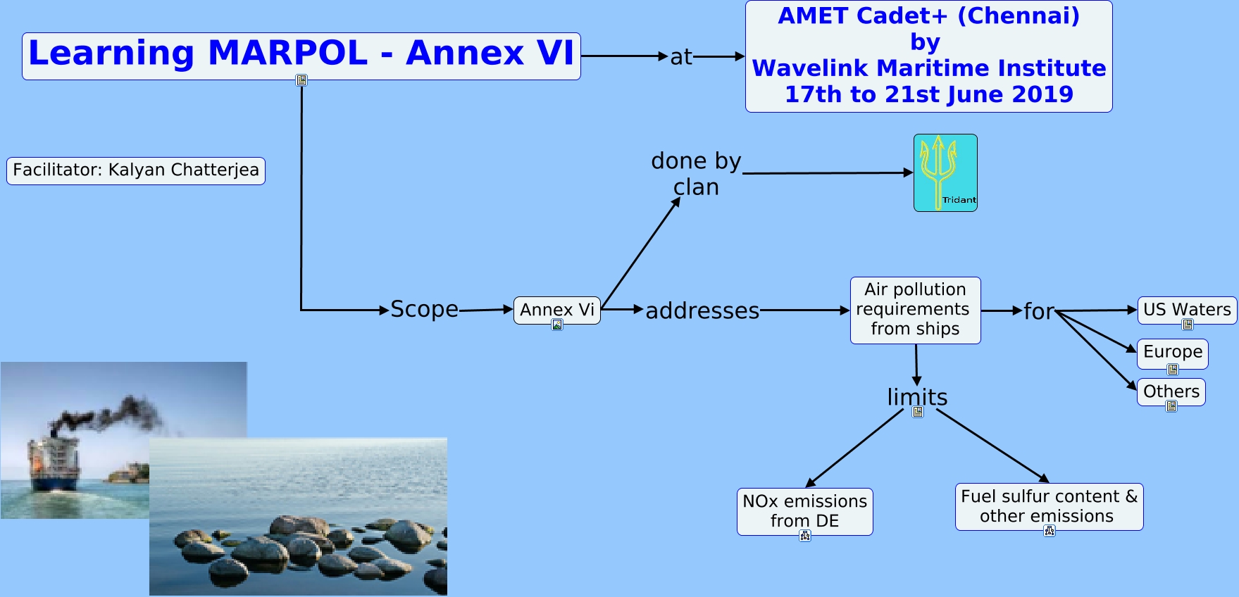 This Concept Map, created with IHMC CmapTools, has information related to: MARPOL-Annex-6, Learning MARPOL - Annex VI Scope Annex Vi, Air pollution requirements from ships limits Fuel sulfur content & other emissions, Air pollution requirements from ships limits NOx emissions from DE, Air pollution requirements from ships for Europe, Annex Vi done by clan, Air pollution requirements from ships for US Waters, Annex Vi addresses Air pollution requirements from ships, Learning MARPOL - Annex VI at AMET Cadet+ (Chennai) by Wavelink Maritime Institute 17th to 21st June 2019, Air pollution requirements from ships for Others