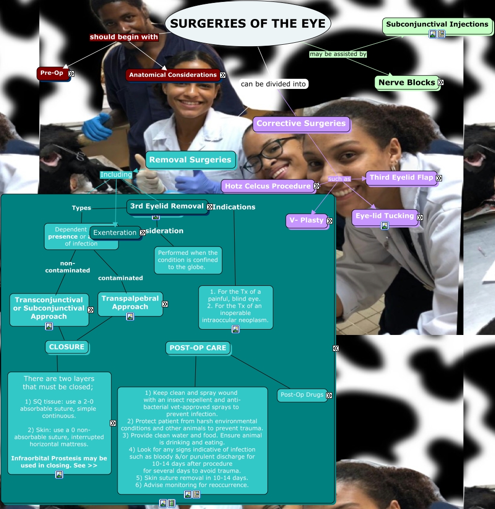 This Concept Map, created with IHMC CmapTools, has information related to: Lab 3- Eye Surgeries, Third Eyelid Removal sectioned into Post up care, 2nd Clamp 3rd Clamp, Pre-op care consisting of Drugs, Post-Op Drugs Apply the following daily Matabicheras Fort Dodge Aerosol Used as a healing agent & larvicide repellent. Contains 34 ml/100ml of Suppona and 51 ml/100ml of Vapona, two phosphorous products as well as Gentian Violet, a healing agent that leads to recovery of tissue. The Vapona kills any larvae that may be present by immediate paralysis, while the Sapona, by its residual power, propels and protects against reinfestation., V-Plasty Wedge Resection Pentagonal resection, Removal Surgeries Including Exenteration, Pack orbit for 5 mins. Then ligate any bleeders before closing STEP 8 Palpate remaining orbital tissue and bone for addtional evidence of neoplasia, Removal Surgeries Including Enucleation, The entire contents of the eye, i.e. the vascular coat, lens, retina, viterous etc. are removed. STEP 2 A spherical silcone prosthetic implant is placed within the scleral shell. The outer shell of the eye and the eyelids are left intact., The optic nerve is severed. STEP 5 Following removal of the globe the eyelid margins, the conjunctiva, the third eyelid and its gland are removed., CLOSURE There are two layers that must be closed; 1) SQ tissue: use a 2-0 absorbable suture, simple continuous. 2) Skin: use a 0 non- absorbable suture, interrupted horizontal mattress. Infraorbital Prostesis may be used in closing. See >>, Corrective Surgeries such as Eye-lid Tucking, Nerve Blocks notably 4 point nerve block, Enucleation Indications 1. For the Tx of a painful, blind eye. 2. For the Tx of an inoperable intraoccular neoplasm., Enucleation Indications 1. For the Tx of a painful, blind eye. 2. For the Tx of an inoperable intraoccular neoplasm., Closure of the orbital is acheived in 3 layers. The 1st layer apposing the tissue close to the orbital rim is commenced loosely. STEP 3 Once the suture has progresed 1/3 of distance to be closed, insert implant into orbit after sterlising it and rinsing in sterile water., Third Eyelid Removal sectioned into Procedure, Perform a lateral canthotomy to allow better access. STEP 2 Grasp conjunctiva & incise for 360 degrees around the globe approx. 5 mm from the limbus., Third eyelid flap How? Prep: Clip the skin around the eye and perform the regular scrubs Procedure: The third eyelid can be sutured ti the dorso-lateral conjunctival fornix or thr dorso-lateral bulbar conjunctiva. A detailed procedure is shown in the linked video The flap can be left on for 7-14 days, Proceedure STEP 1 The entire contents of the eye, i.e. the vascular coat, lens, retina, viterous etc. are removed.