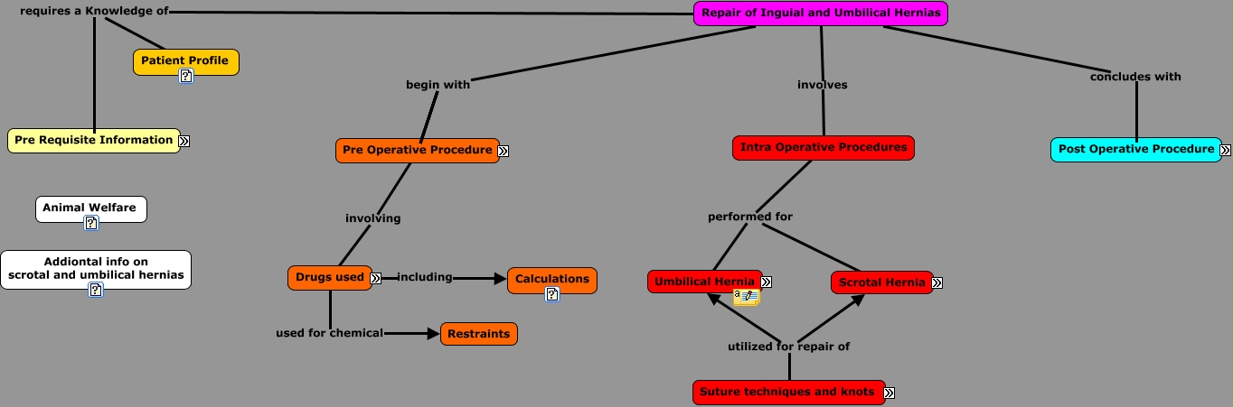 This Concept Map, created with IHMC CmapTools, has information related to: Umbilical and Inguinal Hernias, Pre Operative Procedure involving Drugs used, Repair of Inguial and Umbilical Hernias requires a Knowledge of Types of hernia, Repair of Inguial and Umbilical Hernias concludes with Client Education, Repair of Inguial and Umbilical Hernias concludes with Aftercare, Repair of Inguial and Umbilical Hernias begin with Patient Analysis, Repair of Inguial and Umbilical Hernias requires a Knowledge of What is a hernia?, Repair of Inguial and Umbilical Hernias begin with Instrument Preparation, Intra Operative Procedures performed for Umbilical Hernia, Suture techniques and knots utilized for repair of Scrotal Hernia, Repair of Inguial and Umbilical Hernias begin with Pre Operative Procedure, Drugs used used for chemical Restraints, Repair of Inguial and Umbilical Hernias requires a Knowledge of Anatomy of hernia, Repair of Inguial and Umbilical Hernias concludes with Monitoring, Repair of Inguial and Umbilical Hernias begin with Preparation of the Surgical Site, Repair of Inguial and Umbilical Hernias begin with Consent Form, Repair of Inguial and Umbilical Hernias requires a Knowledge of Differential diagnosis, Repair of Inguial and Umbilical Hernias involves Intra Operative Procedures, Repair of Inguial and Umbilical Hernias concludes with Potential Complications, Drugs used including Calculations, Intra Operative Procedures performed for Scrotal Hernia