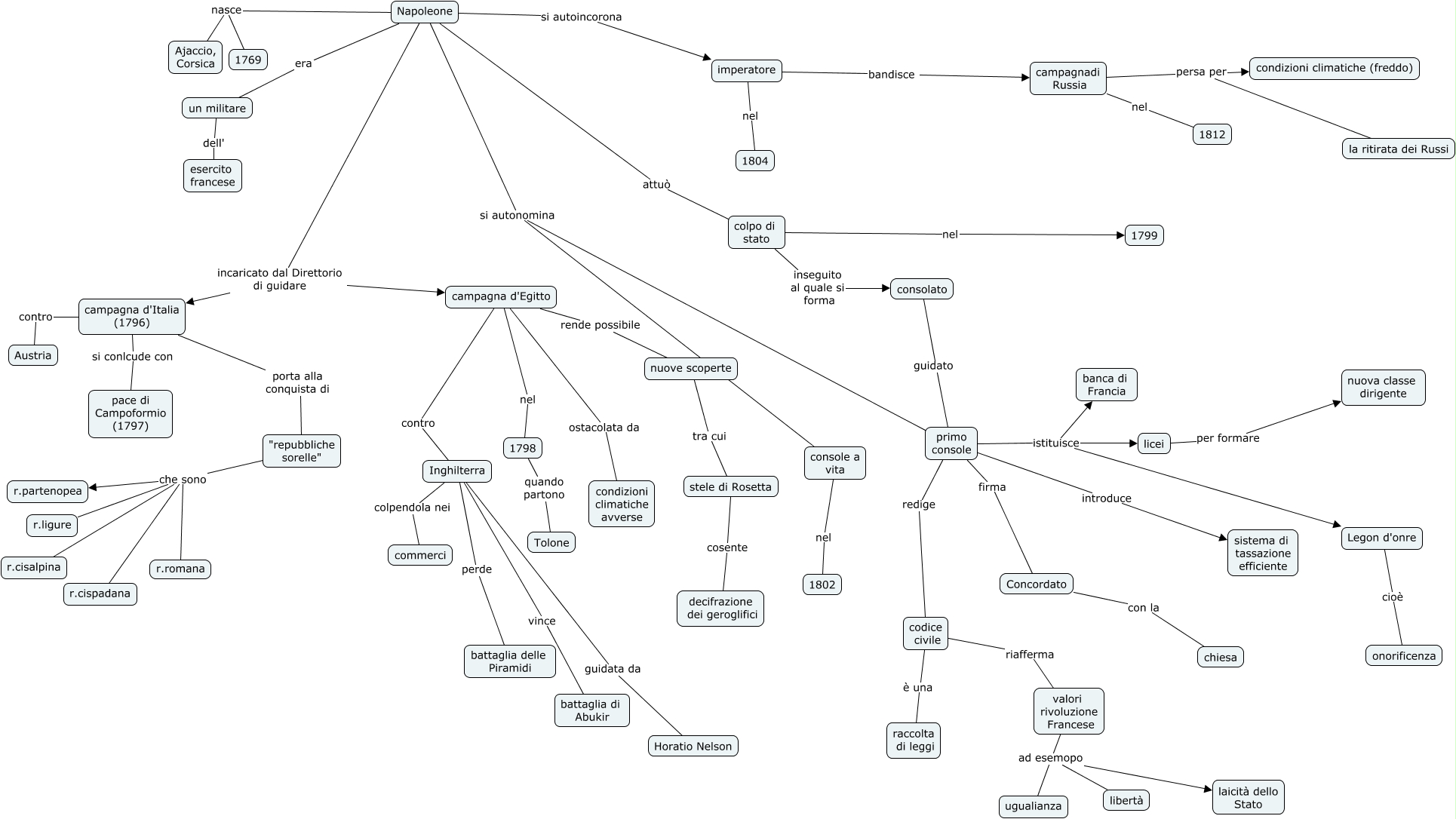 Questa Cmap, creata con IHMC CmapTools, contiene informazioni relative a: napoleone, Napoleone era un militare, Napoleone incaricato dal Direttorio di guidare campagna d'Egitto, primo console istituisce Legon d'onre, codice civile riafferma valori rivoluzione Francese, campagnadi Russia persa per condizioni climatiche (freddo), consolato guidato primo console, Inghilterra vince battaglia di Abukir, "repubbliche sorelle" che sono r.romana, console a vita nel 1802, campagna d'Italia (1796) porta alla conquista di "repubbliche sorelle", campagna d'Egitto nel 1798, licei per formare nuova classe dirigente, un militare dell' esercito francese, valori rivoluzione Francese ad esemopo laicità dello Stato, Napoleone incaricato dal Direttorio di guidare campagna d'Italia (1796), primo console istituisce banca di Francia, Inghilterra perde battaglia delle Piramidi, "repubbliche sorelle" che sono r.ligure, 1798 quando partono Tolone, Inghilterra guidata da Horatio Nelson