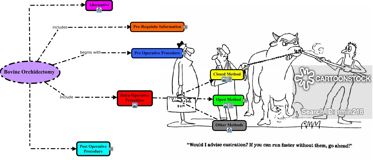 This Concept Map, created with IHMC CmapTools, has information related to: CASTRATION IN BULLS, Bovine Orchidectomy Alternative, Bovine Orchidectomy begins with Pre Operative Procedure, Intra-Operative Procedure ???? Closed Method, Intra-Operative Procedure ???? Open Method, Bovine Orchidectomy Post Operative Procedure, Bovine Orchidectomy Include Intra-Operative Procedure, Intra-Operative Procedure ???? Other Methods, Bovine Orchidectomy includes What is castration