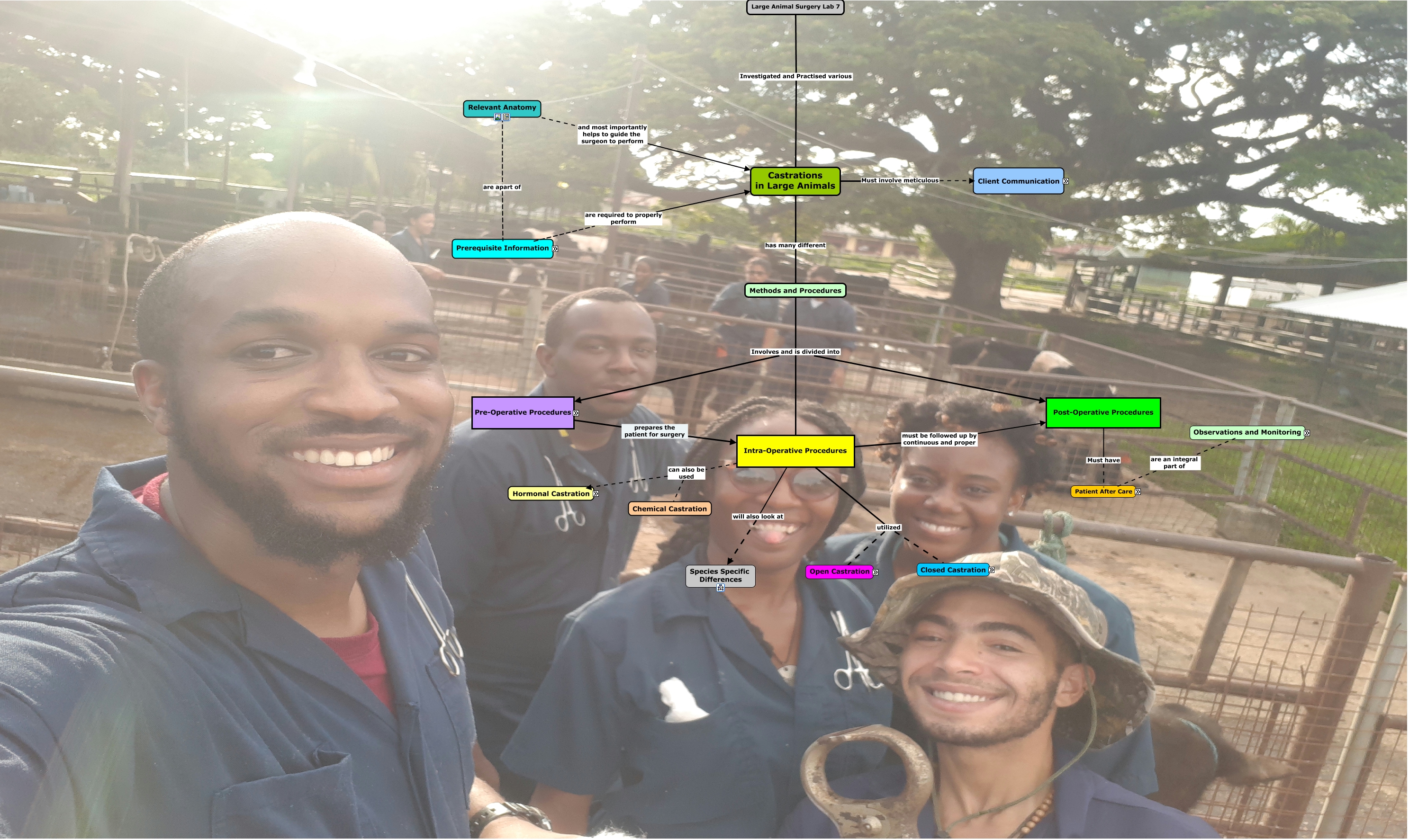This Concept Map, created with IHMC CmapTools, has information related to: GROUP D LAB 7 BULL CASTRATION, Large Animal Surgery Lab 7 Investigated and Practised various Castrations in Large Animals, Patient After Care which involves Pain Management, Relevant Anatomy are apart of Prerequisite Information, Methods and Procedures Involves and is divided into Intra-Operative Procedures, Castration and the different Terminologies, Intra-Operative Procedures can also be used Chemical Castration, Closed Castration Can also be used Elastic Ring Banding, Intra-Operative Procedures utilized Open Castration, Post-Operative Procedures Must have Patient After Care, Open Castration performed Open-closed, Methods and Procedures Involves and is divided into Pre-Operative Procedures, Castration and the different Welfare Significance/ Concerns, Drugs some are used for Anaesthesia /Sedation, Patient After Care which involves Diet & Nutrition, Client Communication must cover Drugs, Client Communication must cover Client Ed., Pre-Operative Procedures includes Surgeon Preparation, Open Castration performed Open-open, Castration and the different Techniques, Patient Preparation and Welfare Concerns