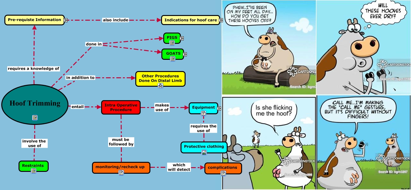 This Concept Map, created with IHMC CmapTools, has information related to: HOOF LAB, Intra Operative Procedure must be followed by monitoring/recheck up, Intra Operative Procedure makes use of Equipment, monitoring/recheck up which will detect complications, Hoof Trimming done in PIGS, Hoof Trimming involve the use of Restraints, Equipment requires the use of Protective clothing, Hoof Trimming entail Intra Operative Procedure, Hoof Trimming requires a knowledge of Pre-requiste Information, Pre-requiste Information also include Indications for hoof care, Hoof Trimming done in GOATS, Hoof Trimming in addition to Other Procedures Done On Distal Limb