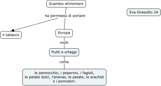 Questa Cmap, creata con IHMC CmapTools, contiene informazioni relative a: 017 Scambio alimentare Eva Gnesotto 2a, frutti e ortaggi come le pannocchio, i peperoni, i fagioli, le patate dolci, l'ananas, le patate, le arachidi e i pomodori., Scambio alimentare ha permesso di portare Europa, Europa molti frutti e ortaggi, Scambio alimentare ha permesso di portare il tabacco