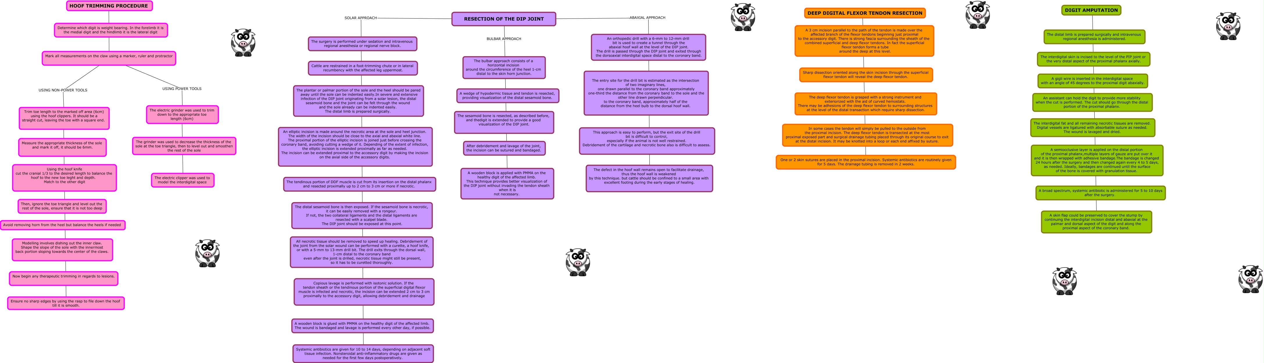 This Concept Map, created with IHMC CmapTools, has information related to: PROCEDURES, RESECTION OF THE DIP JOINT BULBAR APPROACH A wooden block is applied with PMMA on the healthy digit of the affected limb. This technique provides better visualization of the DIP joint without invading the tendon sheath when it is not necessary., The electric grinder was used to trim down to the appropriate toe length (6cm) ???? The electric clipper was used to model the interdigital space, HOOF TRIMMING PROCEDURE ???? Mark all measurements on the claw using a marker, ruler and protractor, DIGIT AMPUTATION ???? A skin flap could be preserved to cover the stump by continuing the interdigital incision distal and abaxial at the palmar and dorsal aspect of the digit and along the proximal aspect of the coronary band., RESECTION OF THE DIP JOINT ABAXIAL APPROACH The defect in the hoof wall remains open to facilitate drainage, thus the hoof wall is weakened by this technique. but cattle should be confined to a small area with excellent footing during the early stages of healing., DEEP DIGITAL FLEXOR TENDON RESECTION ???? One or 2 skin sutures are placed in the proximal incision. Systemic antibiotics are routinely given for 5 days. The drainage tubing is removed in 2 weeks., Trim toe length to the marked off area (6cm) using the hoof clippers. It should be a straight cut, leaving the toe with a square end. ???? Ensure no sharp edges by using the rasp to file down the hoof till it is smooth., RESECTION OF THE DIP JOINT SOLAR APPROACH Systemic antibiotics are given for 10 to 14 days, depending on adjacent soft tissue infection. Nonsteroidal anti-inflammatory drugs are given as needed for the first few days postoperatively., Mark all measurements on the claw using a marker, ruler and protractor USING POWER TOOLS The electric grinder was used to trim down to the appropriate toe length (6cm), Mark all measurements on the claw using a marker, ruler and protractor USING NON-POWER TOOLS Trim toe length to the marked off area (6cm) using the hoof clippers. It should be a straight cut, leaving the toe with a square end.