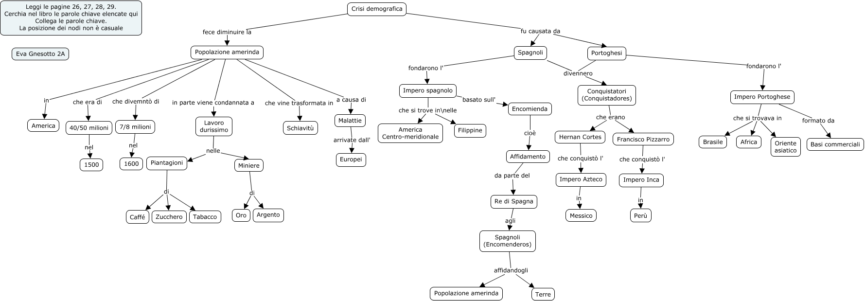 Questa Cmap, creata con IHMC CmapTools, contiene informazioni relative a: 026 027 028 029 Crisi demografica e sistema spagnolo e portoghese Eva Gnesotto 2A, Crisi demografica fu causata da Spagnoli, Impero Portoghese formato da Basi commerciali, Popolazione amerinda in parte viene condannata a Lavoro durissimo, Spagnoli (Encomenderos) affidandogli Terre, Impero Inca in Perù, Portoghesi divennero Conquistatori (Conquistadores), Spagnoli fondarono l' Impero spagnolo, Impero spagnolo che si trove in\nelle America Centro-meridionale, Impero Portoghese che si trovava in Oriente asiatico, Popolazione amerinda che vine trasformata in Schiavitù, Popolazione amerinda in America, Piantagioni di Caffé, Lavoro durissimo nelle Piantagioni, Popolazione amerinda a causa di Malattie, Impero Portoghese che si trovava in Brasile, 40/50 milioni nel 1500, Miniere di Argento, Impero Portoghese che si trovava in Africa, Miniere di Oro, Piantagioni di Zucchero