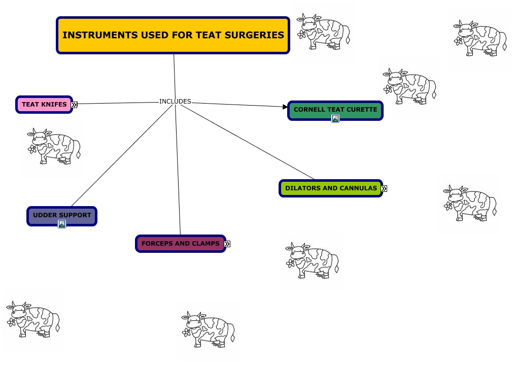 This Concept Map, created with IHMC CmapTools, has information related to: INSTRUMENTS, INSTRUMENTS USED FOR TEAT SURGERIES INCLUDES FORCEPS AND CLAMPS, INSTRUMENTS USED FOR TEAT SURGERIES INCLUDES DILATORS AND CANNULAS, INSTRUMENTS USED FOR TEAT SURGERIES INCLUDES UDDER SUPPORT, INSTRUMENTS USED FOR TEAT SURGERIES INCLUDES CORNELL TEAT CURETTE, INSTRUMENTS USED FOR TEAT SURGERIES INCLUDES TEAT KNIFES